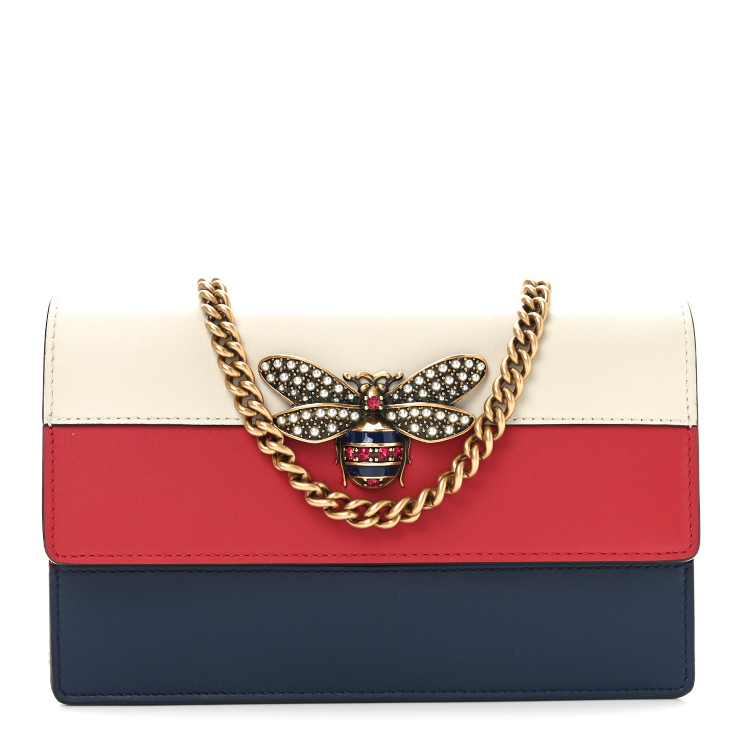 This is an authentic GUCCI Calfskin Queen Margaret Chain Wallet in Mystic White, Blue Agata and Hibiscus Red. This shoulder bag is crafted of smooth calfskin leather in red, ivory and blue with gold hardware. The flap opens to a red leather interior with a zipper pocket and card slots.Follow this item for alerts. Gucci is a registered trademark of Gucci. FASHIONPHILE is not affiliated with Gucci.