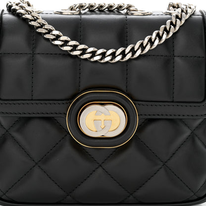 This is an authentic GUCCI Calfskin Quilted Mini Deco Shoulder Bag in Black. This shoulder bag is crafted of smooth calfskin leather in beige with geometric quilting. The bag features a gold plated chain strap, a two-toned vintage interlocking G emblem on the front, and a crossover flap that opens to a matching smooth beige leather interior.Follow this item for alerts. Gucci is a registered trademark of Gucci. FASHIONPHILE is not affiliated with Gucci.