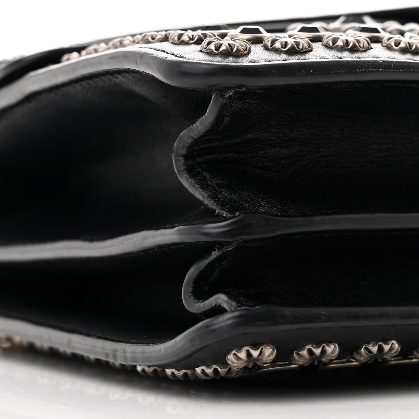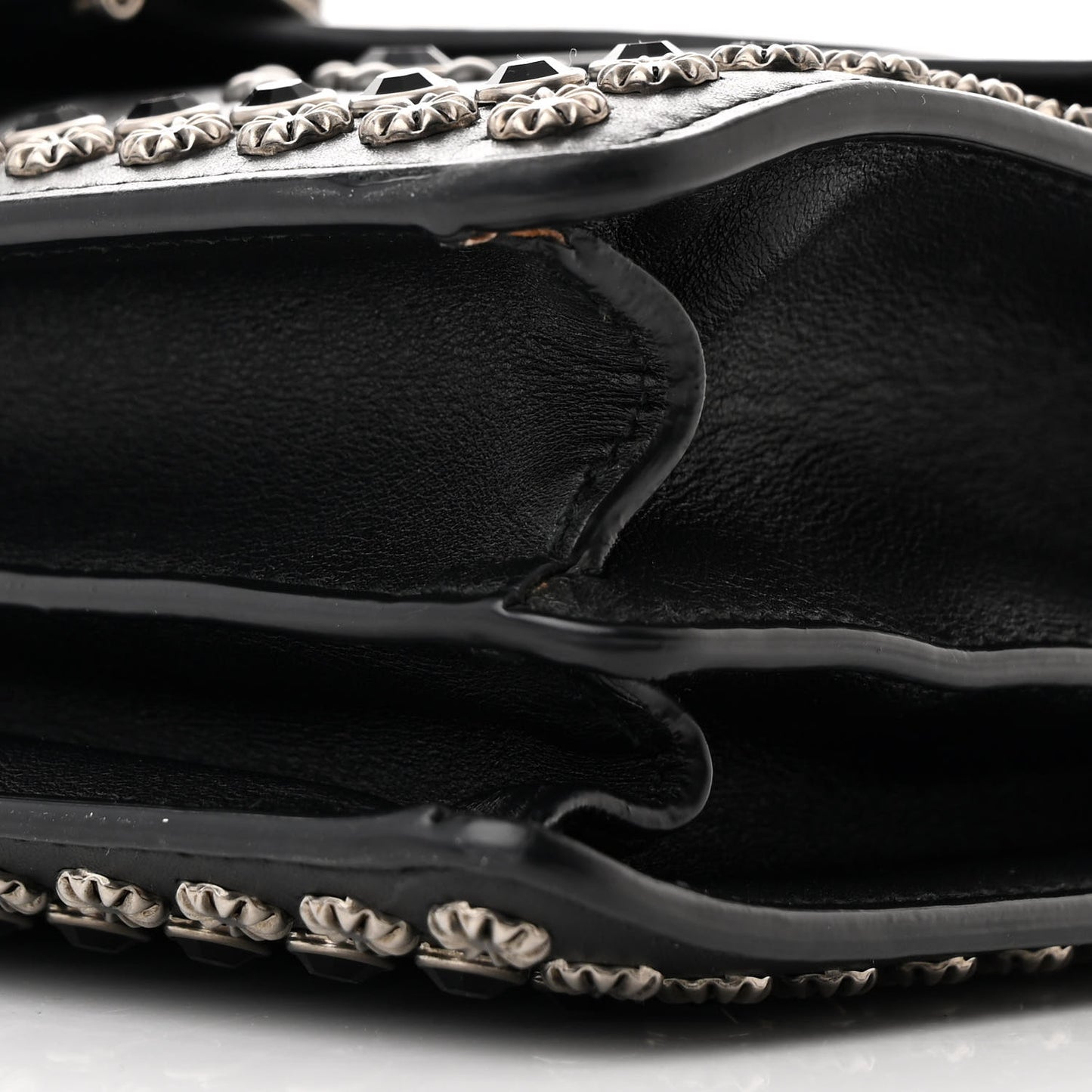 This is an authentic GUCCI Calfskin Studded Small Dionysus Shoulder Bag in Black. This bag is crafted of smooth black calfskin leather with aged ruthenium studs and black crystal trim. This bag features an aged gold chain shoulder strap and a tiger head horseshoe closure on the front flap. The bag opens with a concealed press lock to a beige suede interior with a front flap pocket and a central zipper compartment.Follow this item for alerts. Gucci is a registered trademark of Gucci. FASHIONPHILE is not affiliated with Gucci.