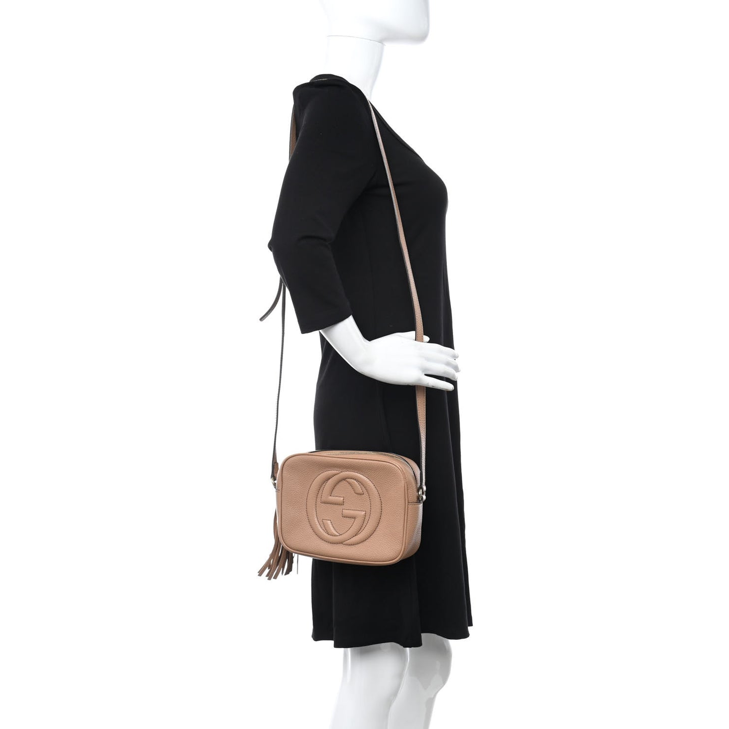This is an authentic GUCCI Pebbled Calfskin Small Soho Disco Bag in Tan. This stylish crossbody bag is crafted of pebbled calfskin leather in golden beige. The bag features an adjustable leather shoulder strap with polished light gold hardware and a prominent interlocking GG logo stitched on the front. The leather tassel zipper pull opens the bag to a natural fiber interior with patch pockets.