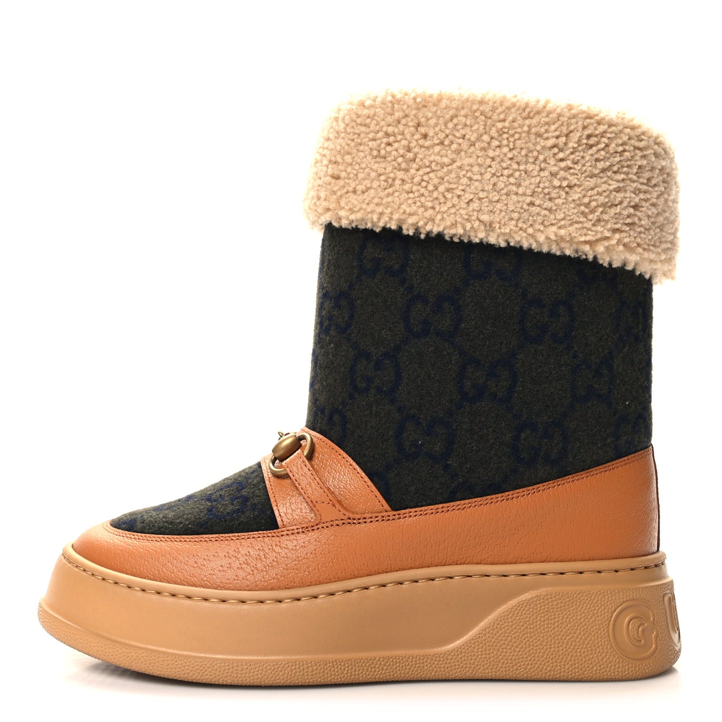 Gucci/ Accessories/ Shoes /Gucci Covered Wool Monogram Textured Dollar Calfskin Shearling Horsebit Snow Boots 39.5 Underwood Blue Hazel Brown