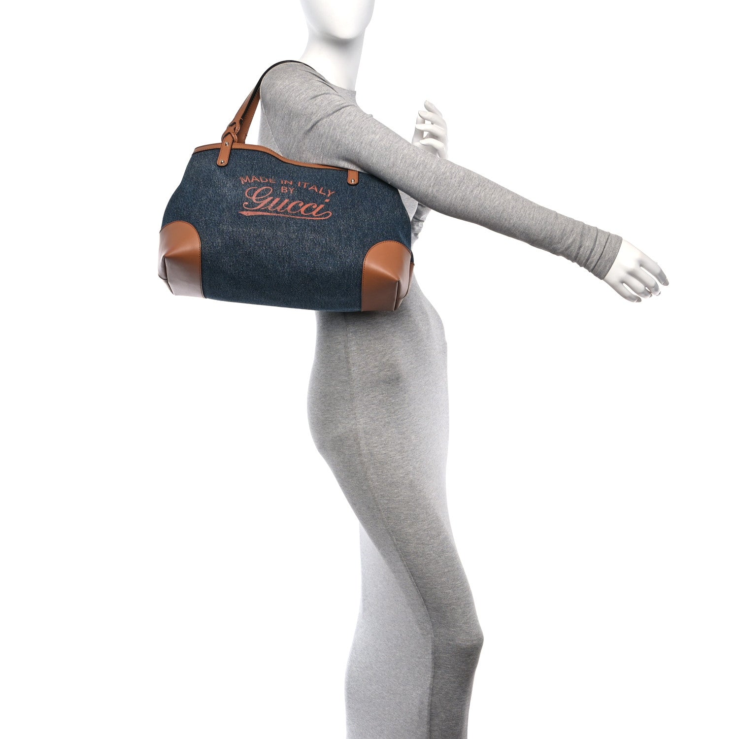 This is an authentic GUCCI Denim Calfskin Tote in Brown. This stylish tote is crafted of dark blue denim with a Gucci logo on the front and brown leather trim. The bag features brown leather top handles and a magnetic strap that opens to a beige fabric interior with zipper and patch pockets.Follow this item for alerts. Gucci is a registered trademark of Gucci. FASHIONPHILE is not affiliated with Gucci.