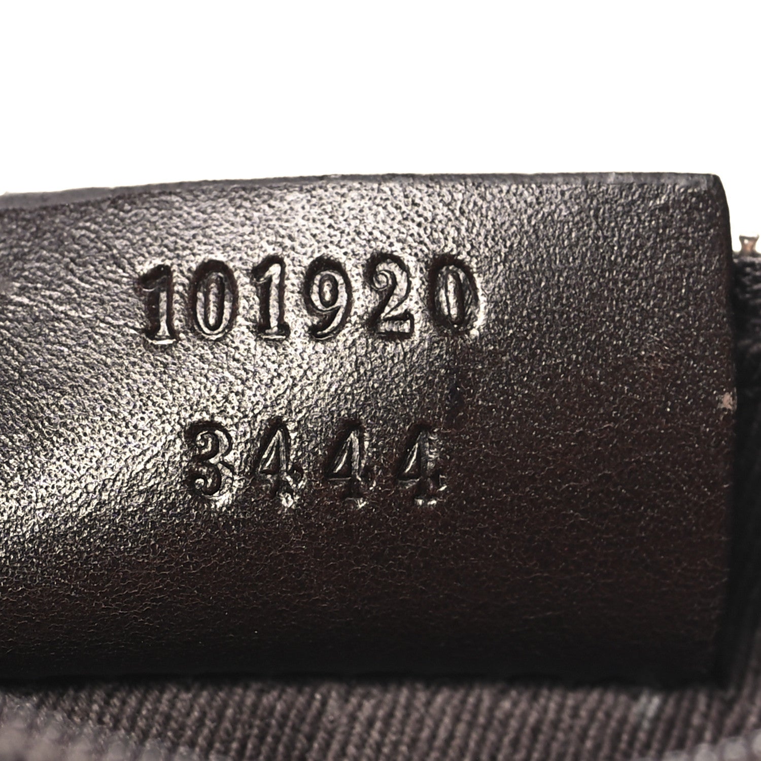 This is an authentic GUCCI Denin Monogram Calfskin Tote in Dark Brown. This stylish shoulder bag is crafted of brown Gucci GG monogram coated canvas. The bag features brown leather shoulder straps and leather side trim with matte brown hardware. The top opens to a spacious fabric interior with an attached pouch.Follow this item for alerts. Gucci is a registered trademark of Gucci. FASHIONPHILE is not affiliated with Gucci.