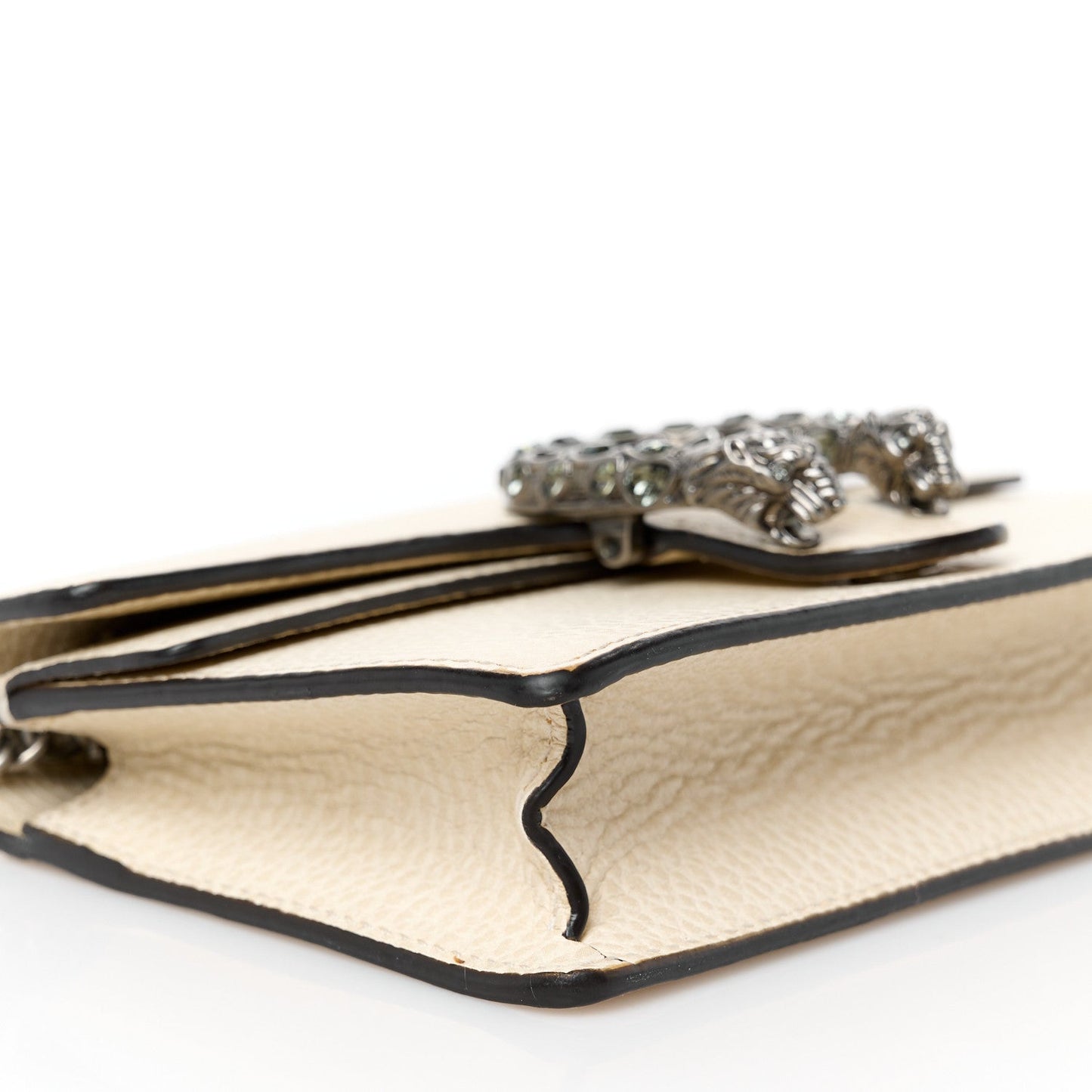 This is an authentic GUCCI Dollar Calfskin Crystal Super Mini Dionysus Shoulder Bag in Mystic White and Black Diamond. This petite bag is crafted of beautifully grained calfskin in white. This shoulder bag features an aged silver chain shoulder strap and a textured horseshoe tiger spur closure encrusted with crystals. The double flap opens to a purple fabric interior with a key ring that can attach to a larger bag.Follow this item for alerts. Gucci is a registered trademark of Gucci. FASHIONPHILE is not affiliated with Gucci.