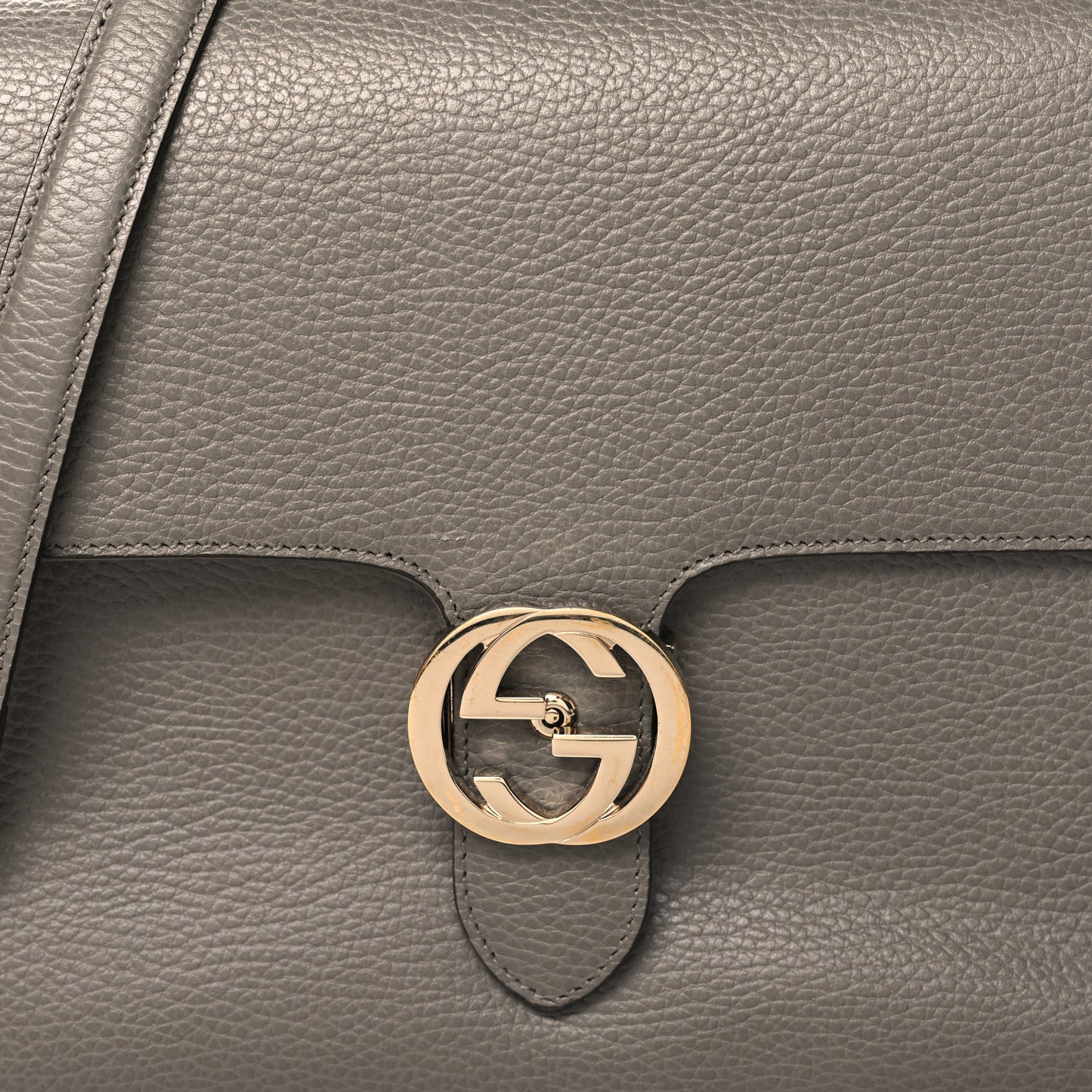 This is an authentic GUCCI Dollar Calfskin Medium Interlocking G Top Handle Shoulder Bag in Loess. This chic shoulder bag is crafted of grained calfskin leather in light grey. This bag features a sturdy top handle and an optional chain link and leather shoulder strap in light gold. The flap opens with a polished gold interlocking G emblem, to a partitioned fabric interior with zipper and patch pockets.Follow this item for alerts. Gucci is a registered trademark of Gucci. FASHIONPHILE is not affiliated with Gucci.