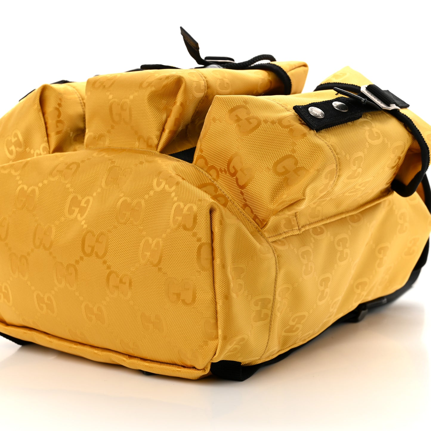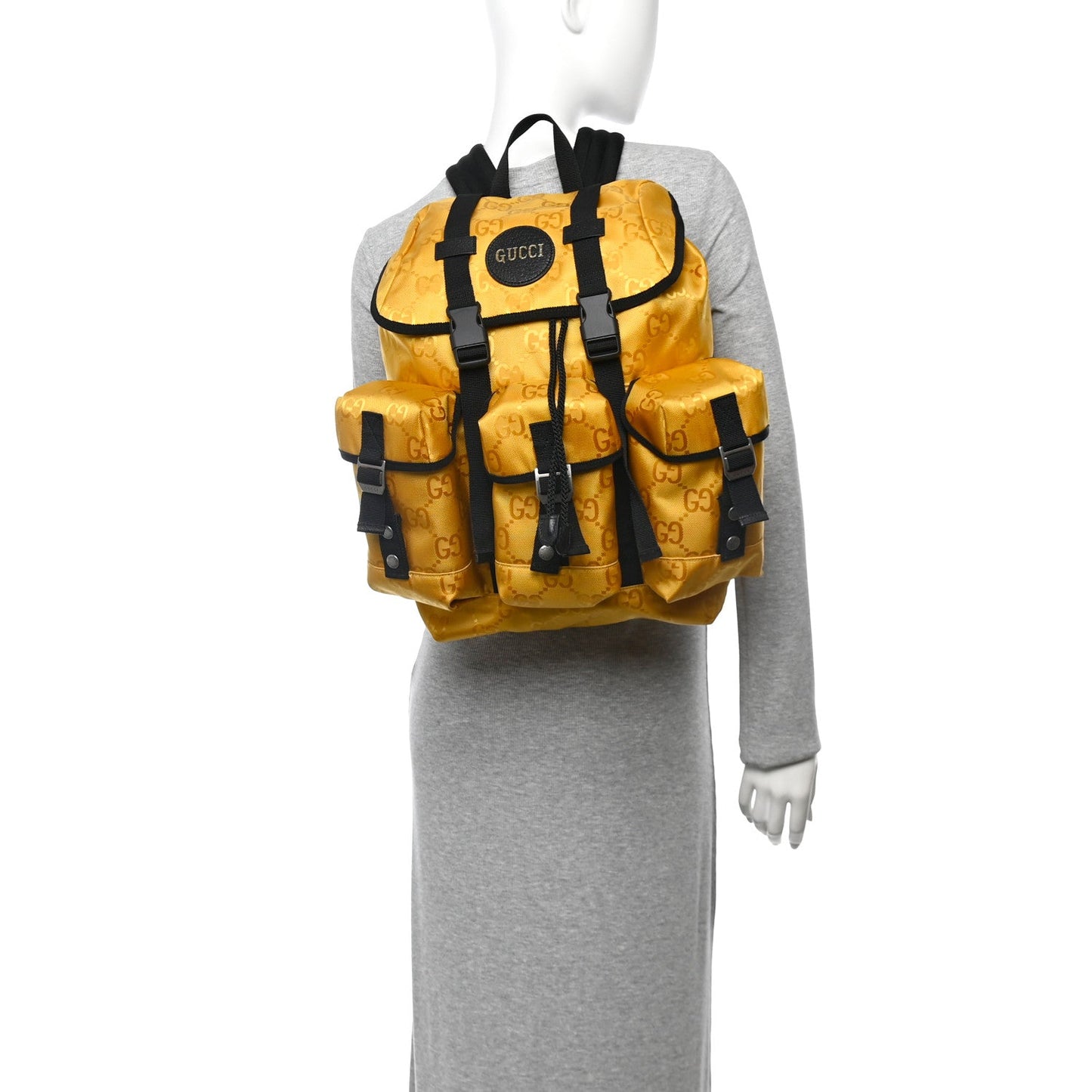 This is an authentic GUCCI Econyl Nylon Monogram Off The Grid Backpack in Crop and Black. This stylish backpack is crafted of yellow Gucci GG monogram canvas and has a leather Gucci patch embossed in gold foil on the front. The bag features 3 front pouches, nylon shoulder straps and aged silver hardware. The top cinch cord relaxes to a spacious yellow nylon interior with a zipper pocket.Follow this item for alerts. Gucci is a registered trademark of Gucci. FASHIONPHILE is not affiliated with Gucci.