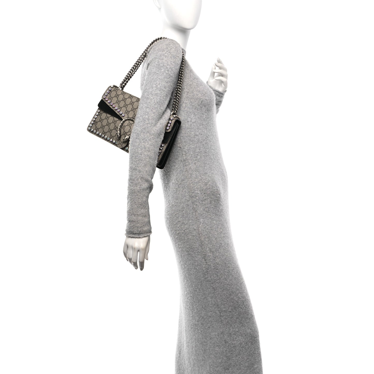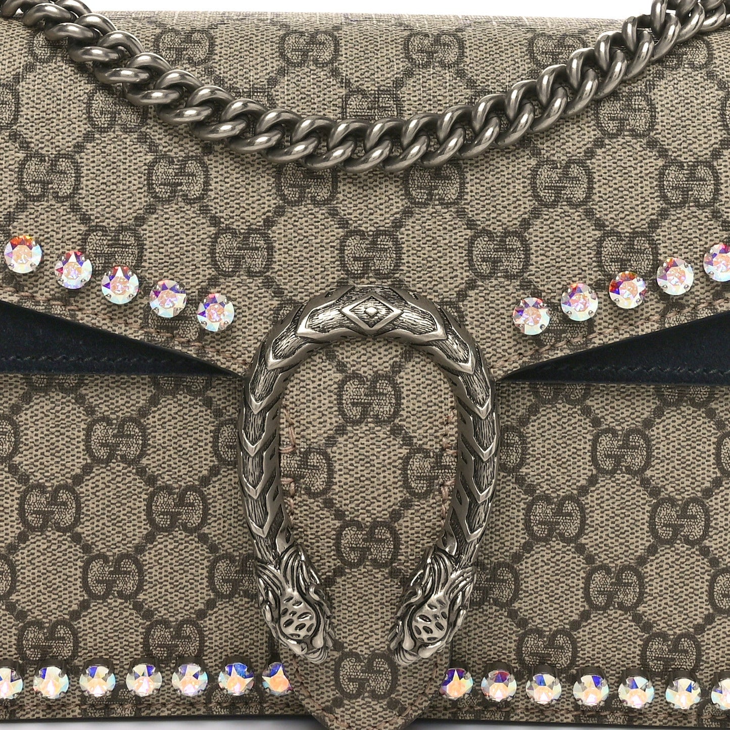 This is an authentic GUCCI GG Supreme Monogram Crystal Small Dionysus Shoulder Bag in Black. This stylish bag is crafted of Gucci GG monogram canvas. This shoulder bag features a second flap of black suede, a matte silver chain shoulder strap, a crystal border around the outside edges of the bag, and a textured horseshoe closure with lion heads at the end. This opens to a black suede and coated canvas interior with a central zipper pocket.Follow this item for alerts. Gucci is a registered trademark of Gucci. FASHIONPHILE is not affiliated with Gucci.