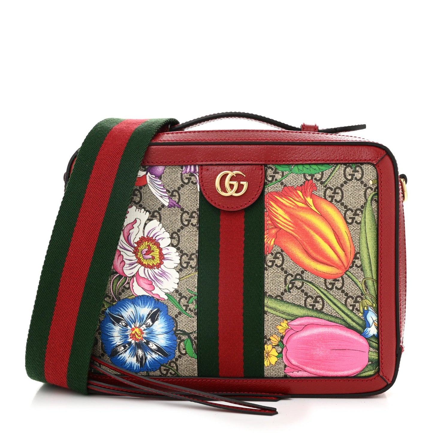 This is an authentic GUCCI GG Supreme Monogram Flora Web Small Ophidia Top Handle Shoulder Bag in Hibiscus Red. This stylish handbag is crafted of a beige monogram canvas with a lovely bright colorful floral pattern. The tote features red leather trim and gold hardware. The top is open to a beige interior with a patch pocket.Follow this item for alerts. Gucci is a registered trademark of Gucci. FASHIONPHILE is not affiliated with Gucci.