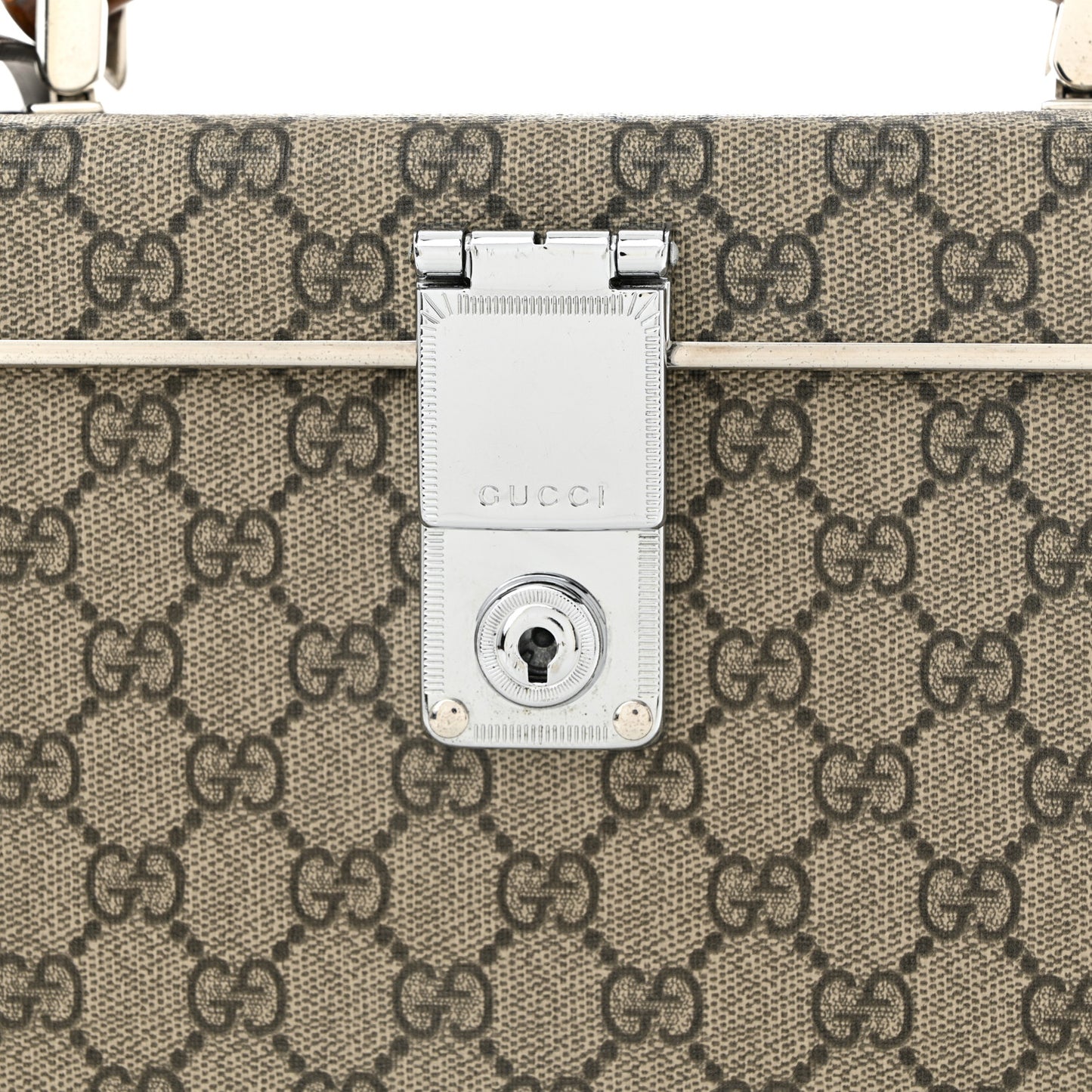 This is an authentic GUCCI GG Supreme Monogram Globe-Trotter Beauty Case in Brown. This stylish case is crafted of GG monogram coated canvas and brown leather. The case features silver hardware, brown leather corner accents, a sturdy bamboo top handle, and a removable brown leather strap. The frontal silver press lock opens to a red fabric interior.Follow this item for alerts. Gucci is a registered trademark of Gucci. FASHIONPHILE is not affiliated with Gucci.