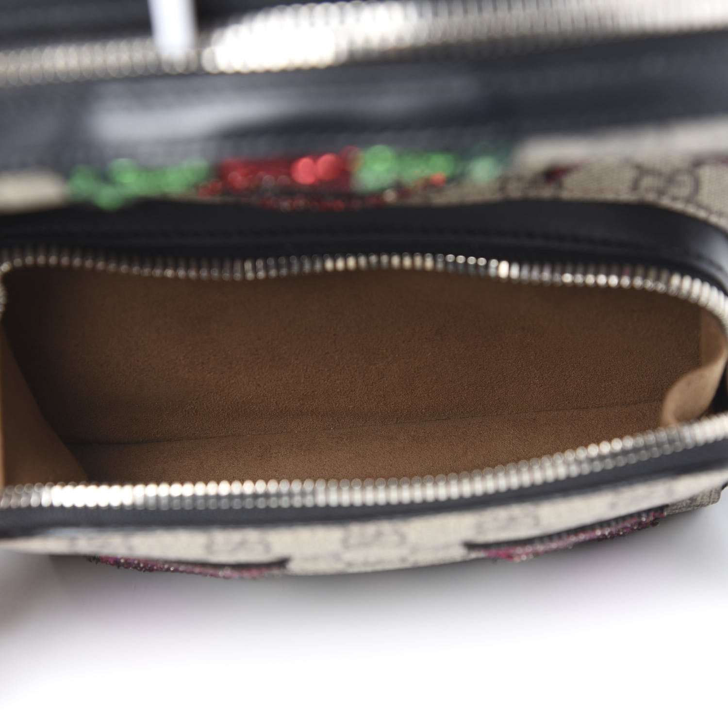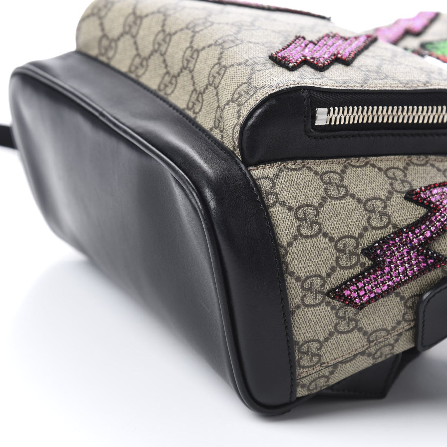 This is an authentic GUCCI GG Supreme Monogram Embroidered Small Backpack in Black. This stylish backpack is crafted of Gucci GG monogram coated canvas embroidered with multicolor crystals. The bag features an external front zipper pocket, nylon shoulder straps and black leather trim with silver hardware. The top zipper opens to a spacious dark beige suede leather interior with zipper and patch pockets. This stylish backpack is suitable for school or light travel, with the designer appeal of Gucci!Follow this item for alerts. Gucci is a registered trademark of Gucci. FASHIONPHILE is not affiliated with Gucci.