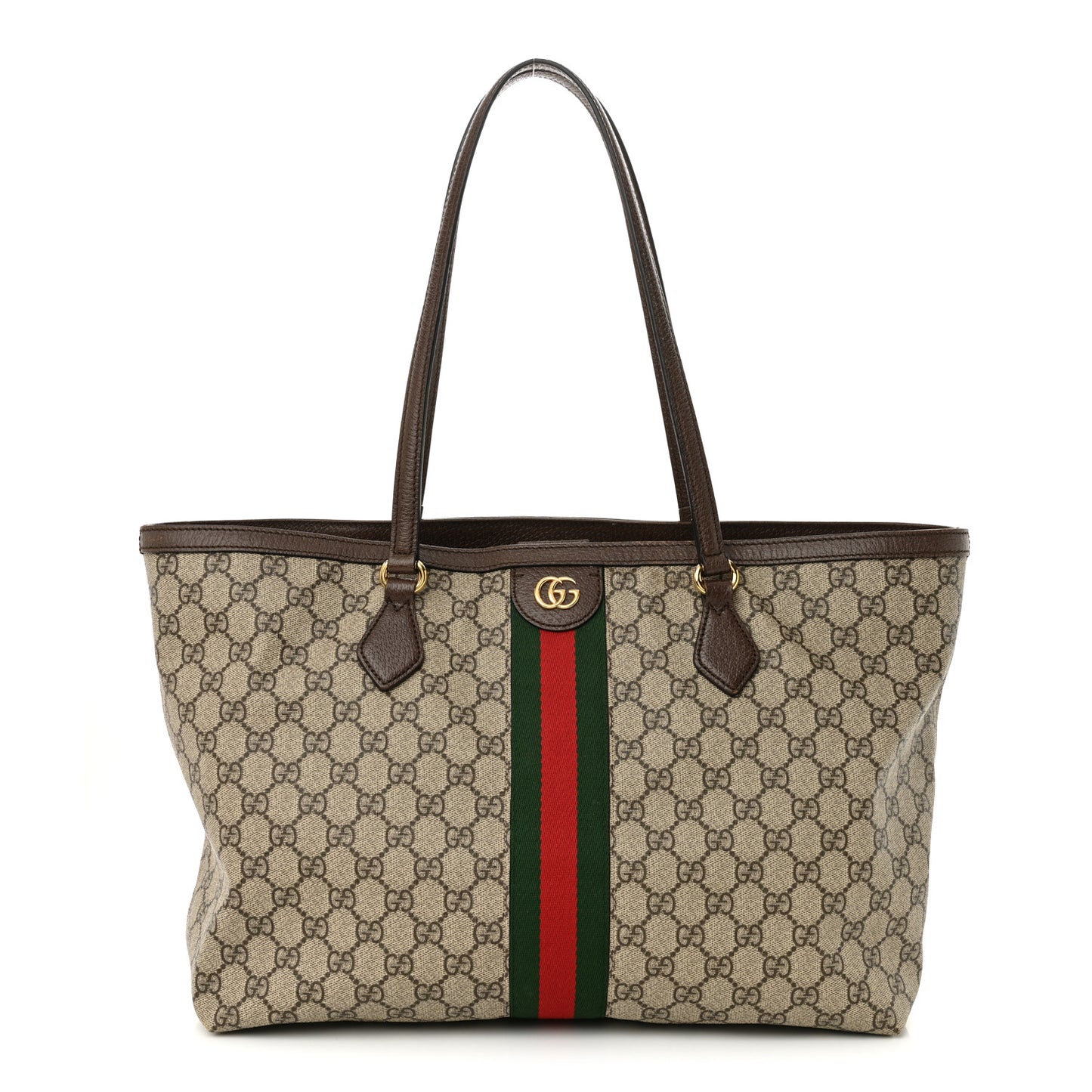 This is an authentic GUCCI GG Supreme Monogram Medium Ophidia Shopping Tote in Brown. This chic tote is crafted of Gucci GG supreme monogram coated canvas with a green and red web stripe detail. The handbag features brown leather strap handles, trim, and gold hardware. The top is open to a beige microfiber interior with zipper and patch pockets.Follow this item for alerts. Gucci is a registered trademark of Gucci. FASHIONPHILE is not affiliated with Gucci.