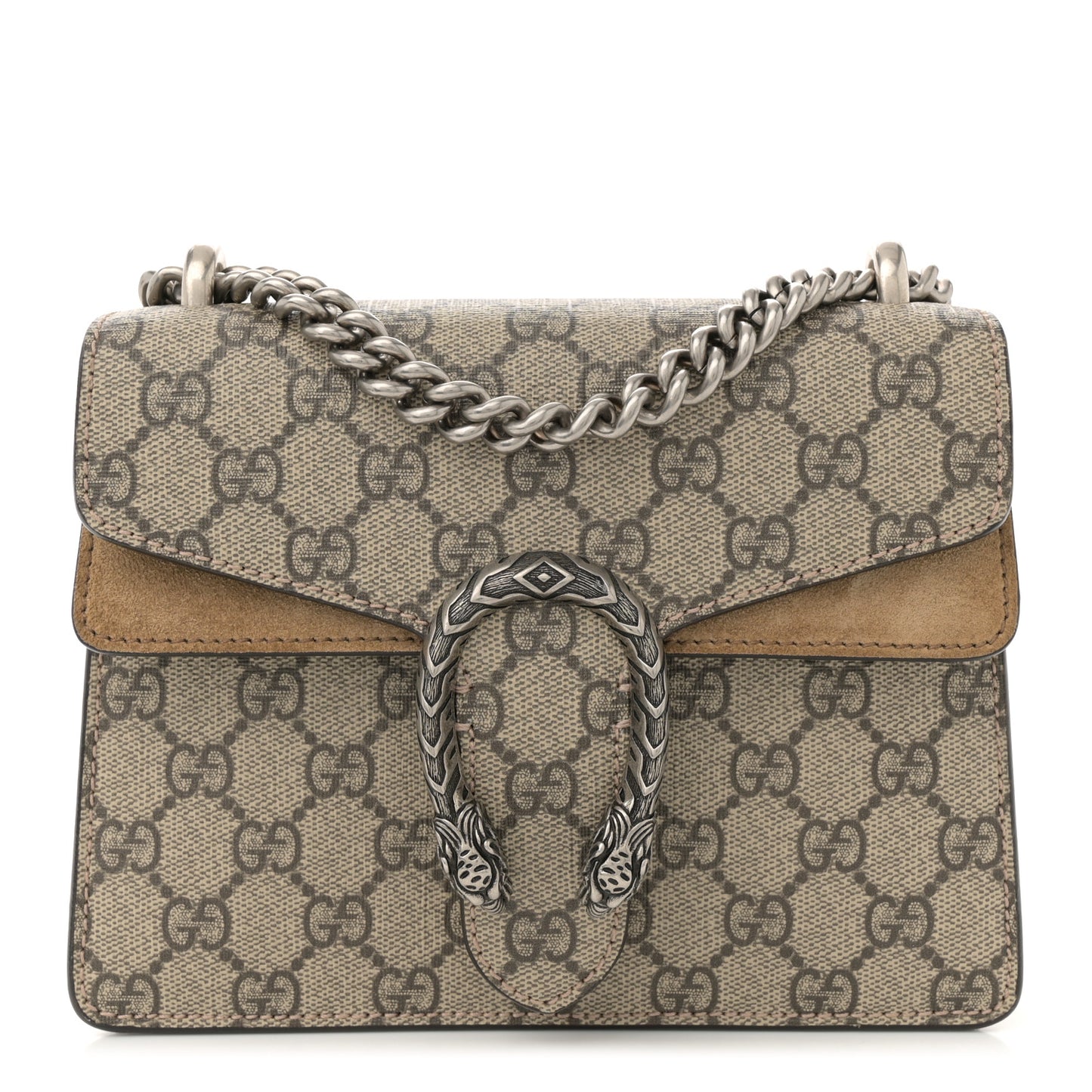 This is an authentic GUCCI GG Supreme Monogram Mini Dionysus Shoulder Bag in Taupe. This stylish bag is crafted of traditional Gucci GG monogram supreme canvas. This shoulder bag features an aged silver chain shoulder strap and a textured horseshoe tiger spur closure. The double flap opens to reveal an interior taupe brown suede flap and a coated canvas front pocket. The main compartment features a brown suede and monogram canvas interior.Follow this item for alerts. Gucci is a registered trademark of Gucci. FASHIONPHILE is not affiliated with Gucci.
