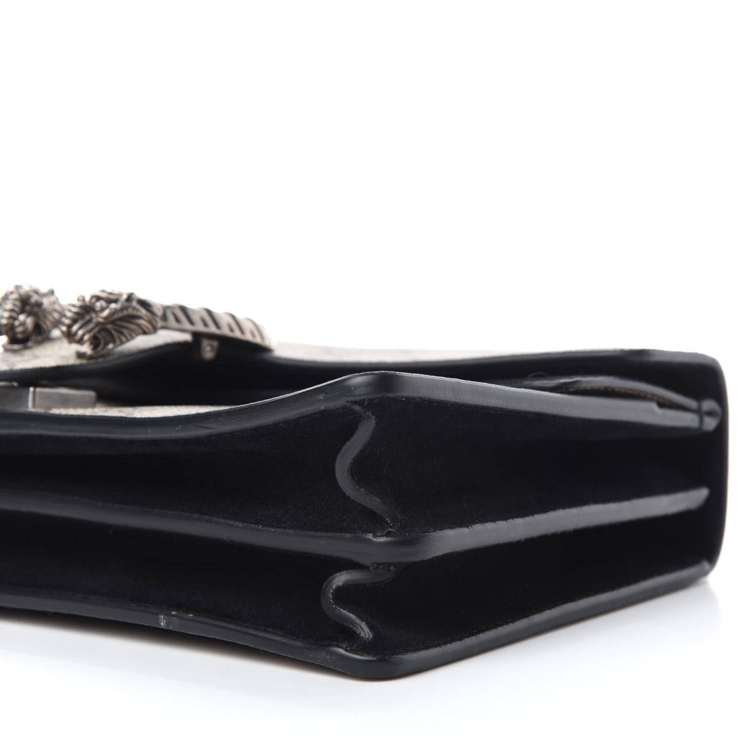 This is an authentic GUCCI GG Supreme Monogram Small Dionysus Shoulder Bag in Black. This stylish bag is crafted of Gucci GG monogram canvas. This shoulder bag features a second flap of black suede, a silver chain shoulder strap, and a textured horseshoe closure with lion heads at the end. This opens to a black suede and coated canvas interior with a central zipper pocket.Follow this item for alerts. Gucci is a registered trademark of Gucci. FASHIONPHILE is not affiliated with Gucci.