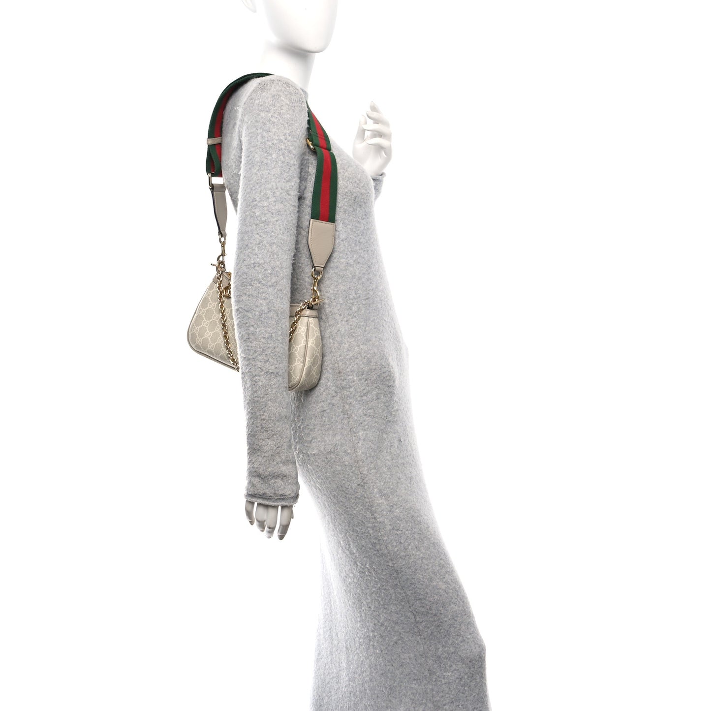 This is an authentic GUCCI GG Supreme Monogram Textured Dollar Calfskin Web Small Ophidia GG Handbag in Beige, Mystic White, and Oatmeal. This shoulder bag is crafted of ivory on beige Gucci GG monogram coated canvas with ivory leather trim. This bag features a gold chain link strap and an optional green and red web-striped shoulder strap. The top zipper opens to a beige fabric interior with a leather patch pocket.Follow this item for alerts. Gucci is a registered trademark of Gucci. FASHIONPHILE is not affiliated with Gucci.