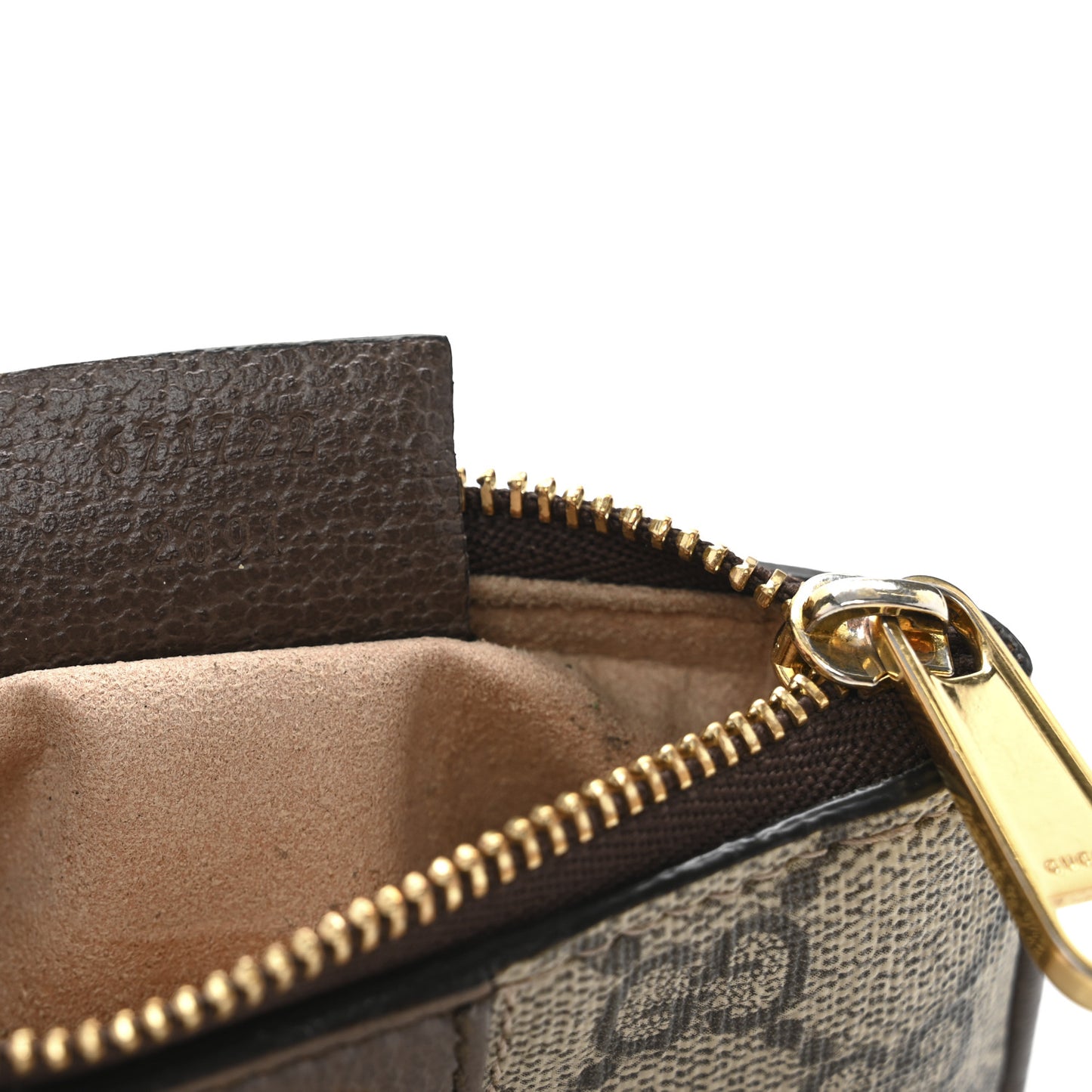 This is an authentic GUCCI GG Supreme Monogram Web Ophidia Key Case in Beige and New Acero. This coin purse is crafted of coated canvas with the Gucci monogram motif. This petit bag features brown leather trim, a polished gold GG logo on the front, and a red and green web stripe. The top zipper opens to a beige fabric interior with a D-ring keychain.Follow this item for alerts. Gucci is a registered trademark of Gucci. FASHIONPHILE is not affiliated with Gucci.
