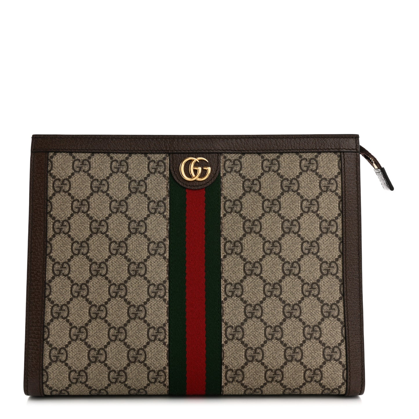 This is a guaranteed authentic GUCCI GG Supreme Monogram Web Ophidia Pouch in Brown. This stylish travel bag is crafted of GG supreme monogram coated canvas with brown leather trim and the signature red and green web fabric stripe down the center. The top unzips to a beige microfiber lining with a pocket.Follow this item for alerts. Gucci is a registered trademark of Gucci. FASHIONPHILE is not affiliated with Gucci.