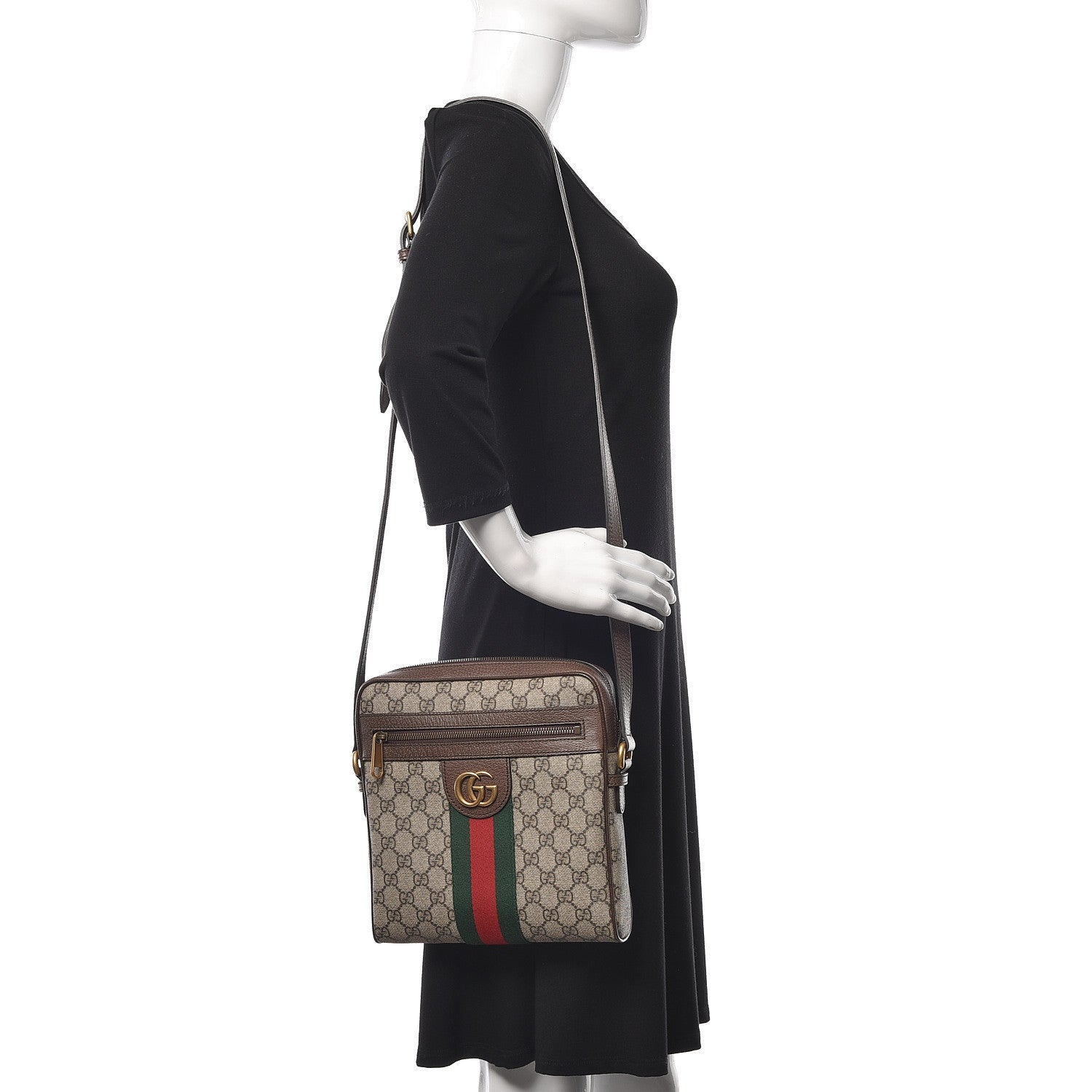 This is an authentic GUCCI GG Supreme Monogram Web Small Ophidia Messenger Bag in Brown. This crossbody bag is crafted of GG supreme monogram coated canvas, with brown leather trim. The bag features an adjustable brown leather shoulder strap with aged gold hardware, a red and green web stripe detail down the center, and a matching gold Gucci GG logo on the crossover flap. The bag opens to a natural fabric interior with zipper and patch pockets.Follow this item for alerts. Gucci is a registered trademark of Gucci. FASHIONPHILE is not affiliated with Gucci.