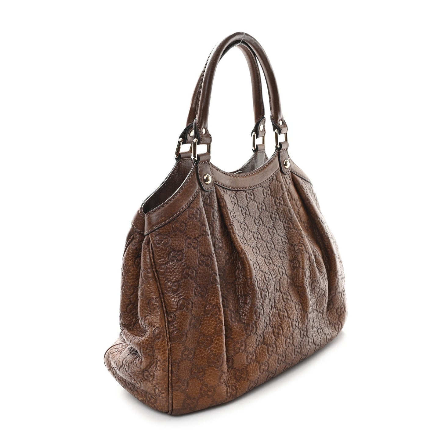 This is an authentic GUCCI Guccissima Medium Sukey Tote in Brown. This chic shoulder bag is crafted of pleated Guccissima monogram embossed leather in brown. The bag features rolled leather top handles with polished light brass hardware. The top opens to a spacious beige fabric interior with a zipper pocket.Follow this item for alerts. Gucci is a registered trademark of Gucci. FASHIONPHILE is not affiliated with Gucci.