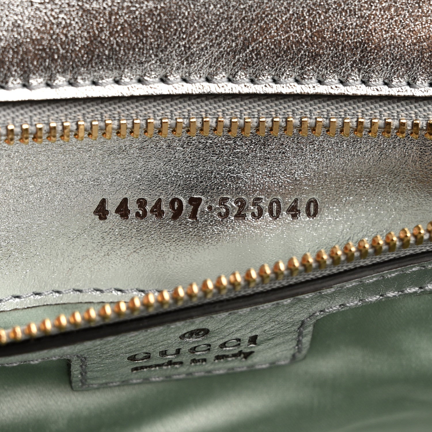 This is an authentic GUCCI Iridescent Nappa Chevron Matelasse Small GG Marmont Shoulder Bag in Iridescent Snow Light Blue. This handbag is crafted of soft nappa leather in an iridescent blue. This bag features a leather and gold chain shoulder strap with a gold interlocking GG logo on the front panel. The top zipper opens to a matching satin interior with a zipper pocket.Follow this item for alerts. Gucci is a registered trademark of Gucci. FASHIONPHILE is not affiliated with Gucci.