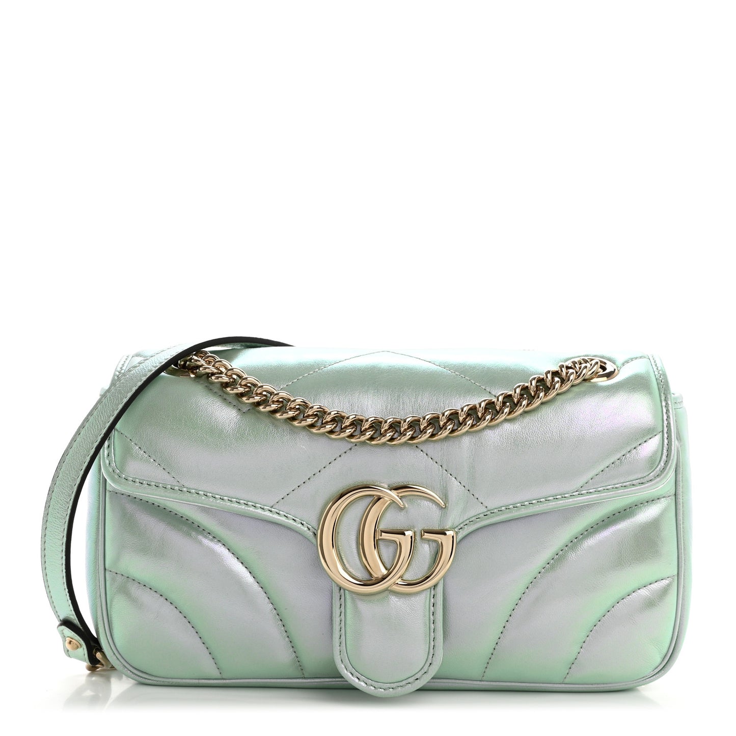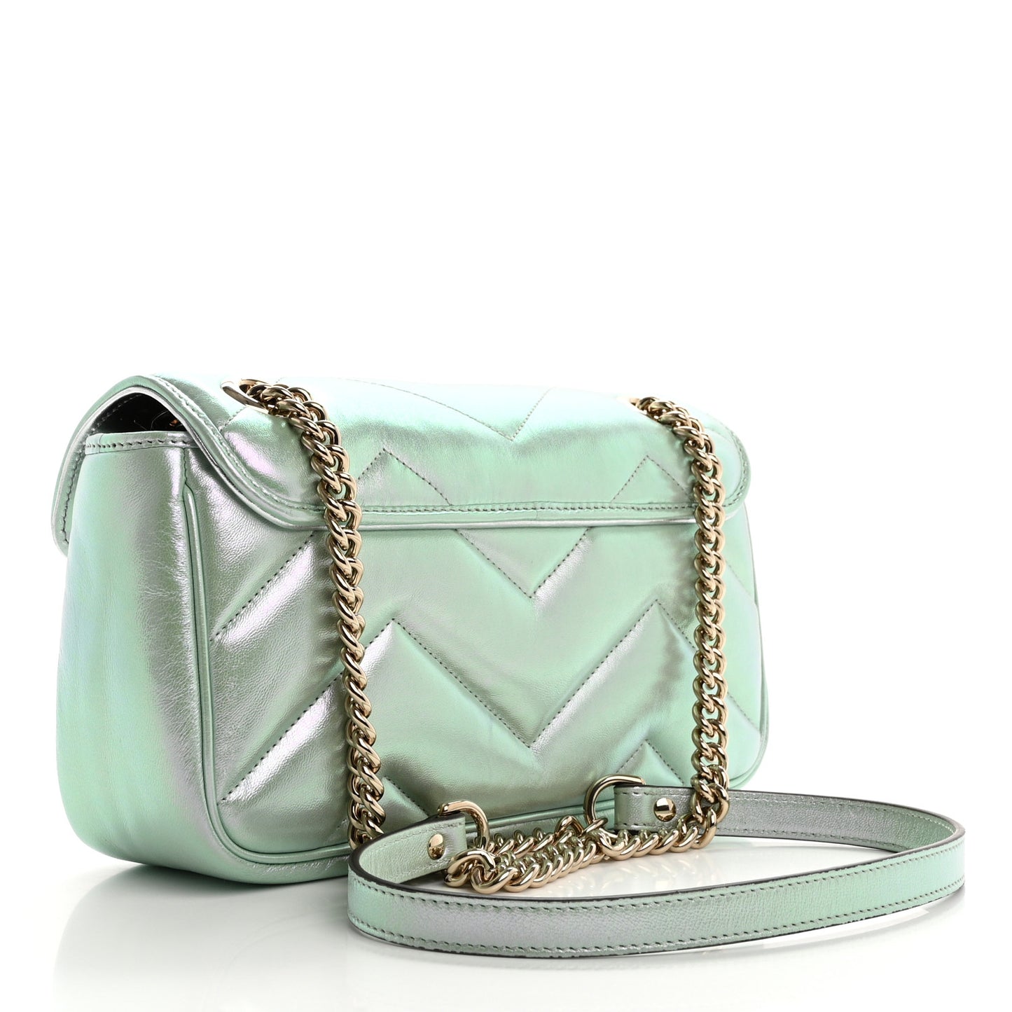This is an authentic GUCCI Iridescent Nappa Chevron Matelasse Small GG Marmont Shoulder Bag in Iridescent Snow Light Blue. This handbag is crafted of soft nappa leather in an iridescent blue. This bag features a leather and gold chain shoulder strap with a gold interlocking GG logo on the front panel. The top zipper opens to a matching satin interior with a zipper pocket.Follow this item for alerts. Gucci is a registered trademark of Gucci. FASHIONPHILE is not affiliated with Gucci.