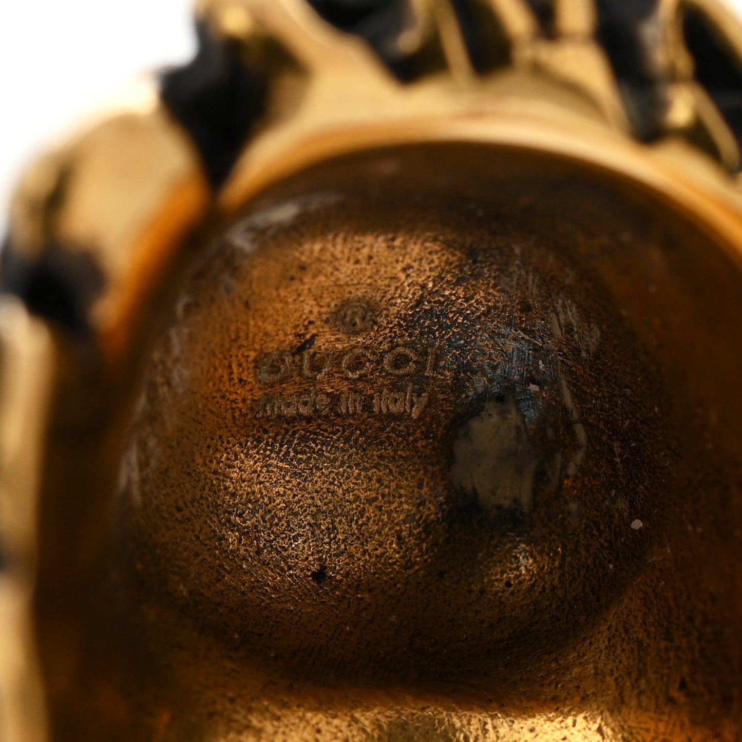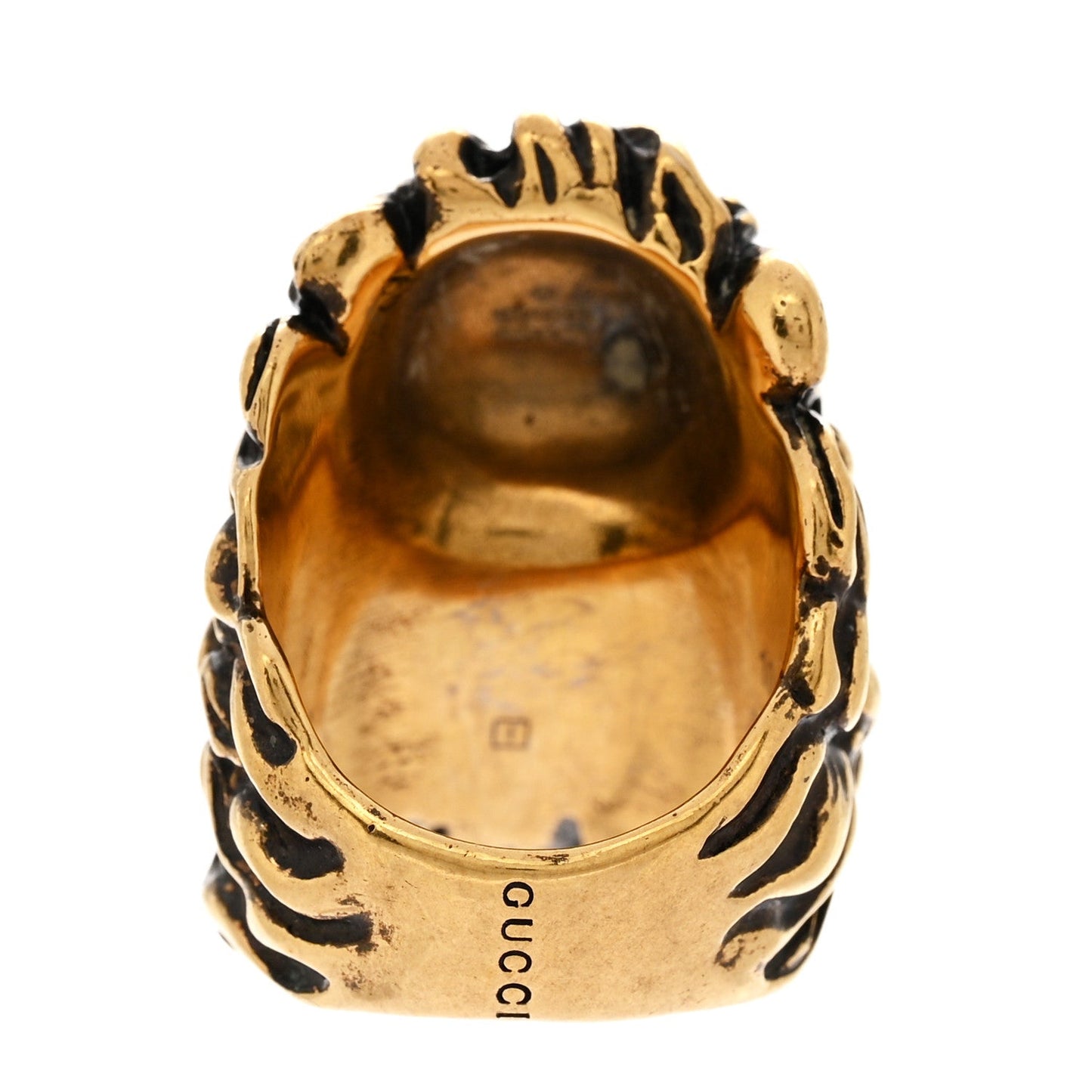 This is an authentic GUCCI Metal Glass Pearl Lion Head Ring size 10/62 in Aged Gold. This simply chic ring is made of metal with an aged gold finish and features a lion head with a resin pearl as an accent of sophisticated style.Follow this item for alerts. Gucci is a registered trademark of Gucci. FASHIONPHILE is not affiliated with Gucci.