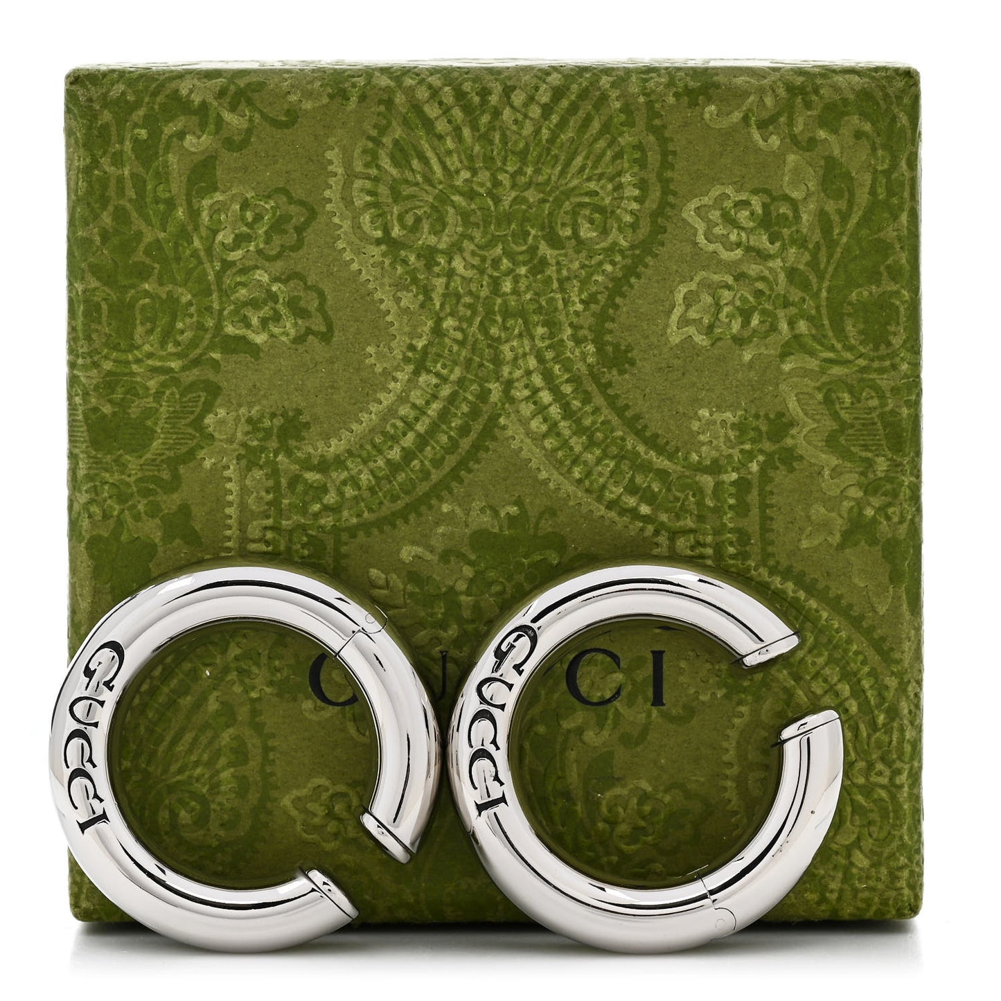 This is an authentic pair of GUCCI Metal Speculum Majus Cuff Earrings in Silver. These ear cuffs are engraved with "Speculum Majus" on one side and "Gucci" on the other.Follow this item for alerts. Gucci is a registered trademark of Gucci. FASHIONPHILE is not affiliated with Gucci.