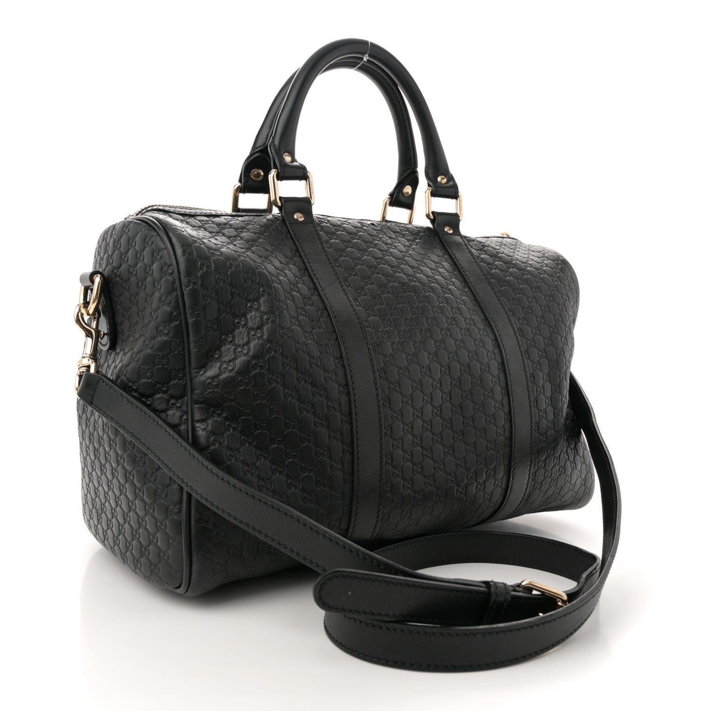 This is an authentic GUCCI Microguccissima Medium Joy Boston in Black. This chic Boston bag is finely crafted of black Gucci monogram embossed leather. The bag features rolled leather top handles, an optional adjustable shoulder strap, and polished brass hardware. The top zipper opens to a coarse linen interior with zipper and patch pockets.Follow this item for alerts. Gucci is a registered trademark of Gucci. FASHIONPHILE is not affiliated with Gucci.