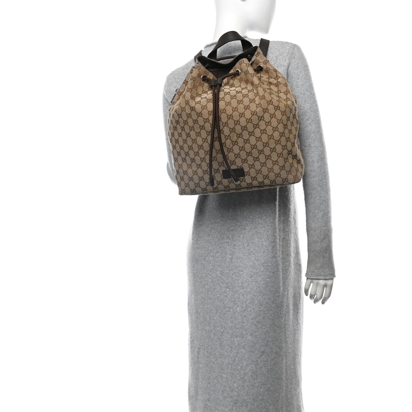 This is an authentic GUCCI Monogram Dollar Calfskin O Drawstring Backpack in Beige, Ebony, Testa di Moro, and Dark Chocolate. This backpack is crafted of Gucci GG monogram canvas. The bag features dark brown leather trim, a drawstring top, a side zipper, and dark brown leather shoulder straps. The top opens to a dark brown fabric interior with patch pockets.Follow this item for alerts. Gucci is a registered trademark of Gucci. FASHIONPHILE is not affiliated with Gucci.