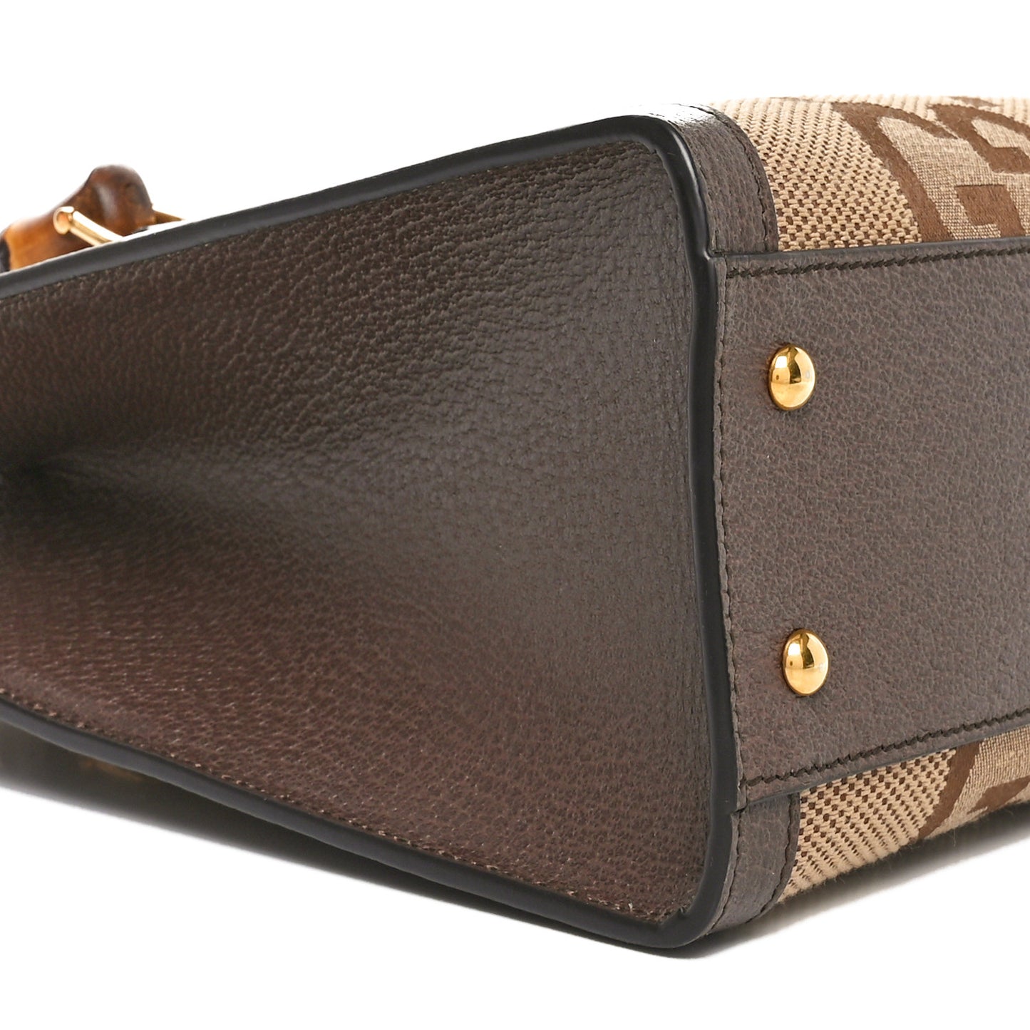 This is an authentic GUCCI Monogram Jumbo GG Textured Dollar Calfskin Small Diana Tote Bag in Camel, Ebony, and New Acero. This shoulder bag is crafted of oversized monogram canvas in beige. The bag has dark brown leather trim with sturdy bamboo top handles and features a gold GG logo. This handbag opens with a magnetic crossover flap to a beige leather interior with a patch pocket.Follow this item for alerts. Gucci is a registered trademark of Gucci. FASHIONPHILE is not affiliated with Gucci.
