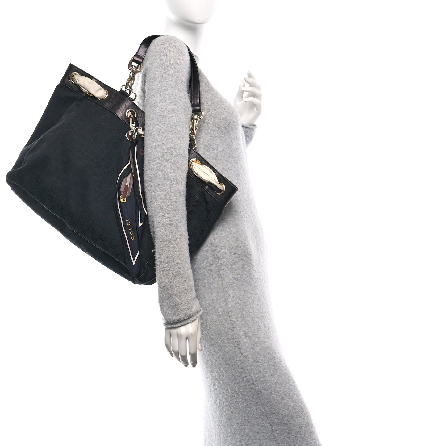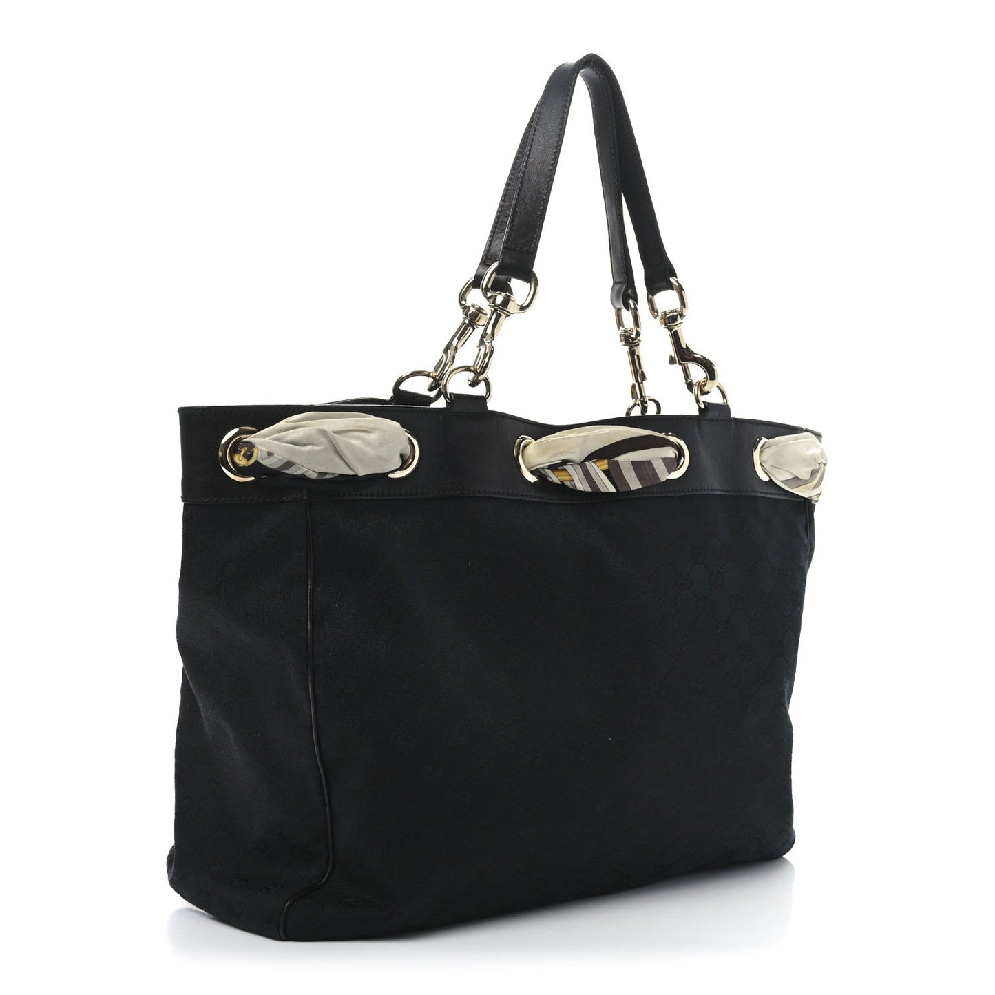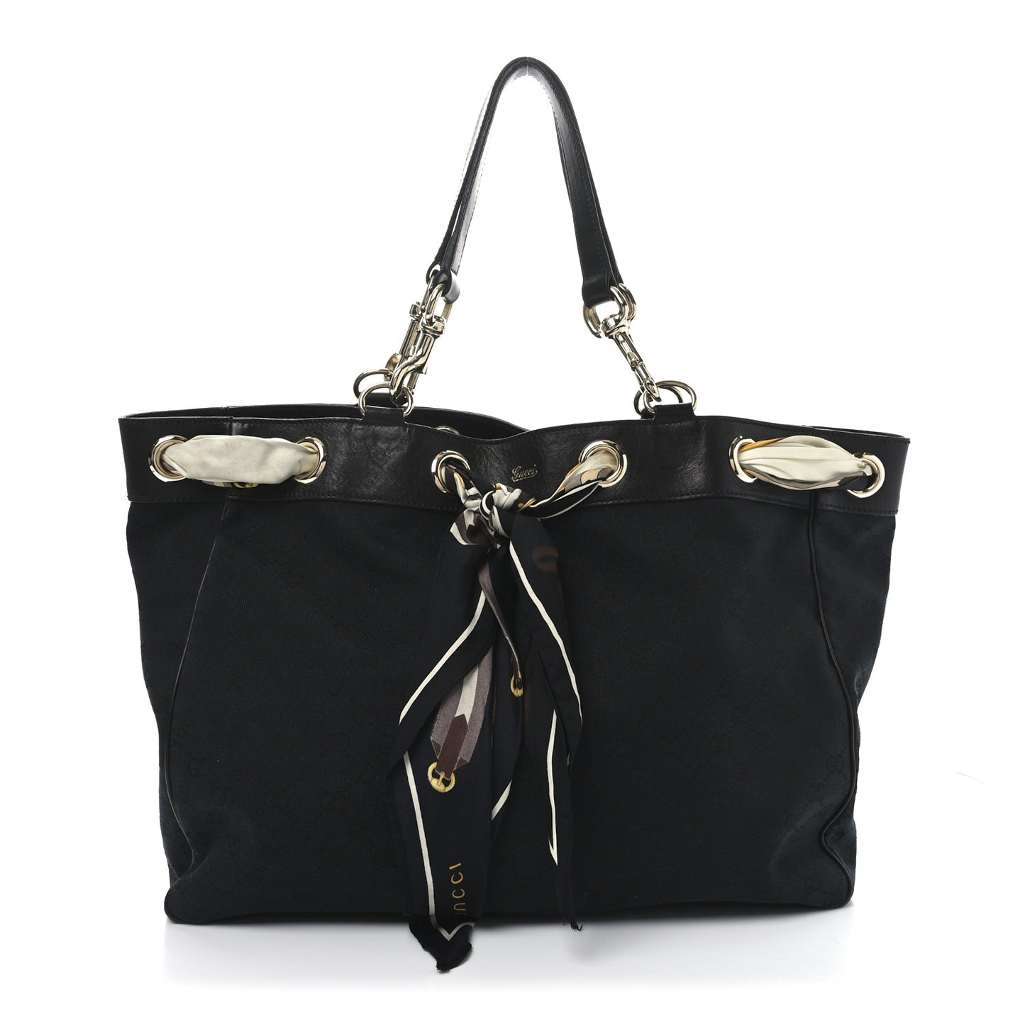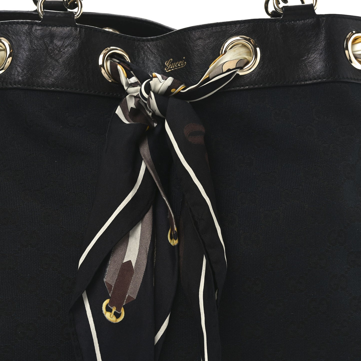 This is an authentic GUCCI Monogram Large Positano Tote in Black. This tote is crafted of black Gucci monogram canvas with black leather trim and decorative scarf looped through the top. The bag features black leather top straps and opens to a black fabric interior with zipper and patch pockets.Follow this item for alerts. Gucci is a registered trademark of Gucci. FASHIONPHILE is not affiliated with Gucci.