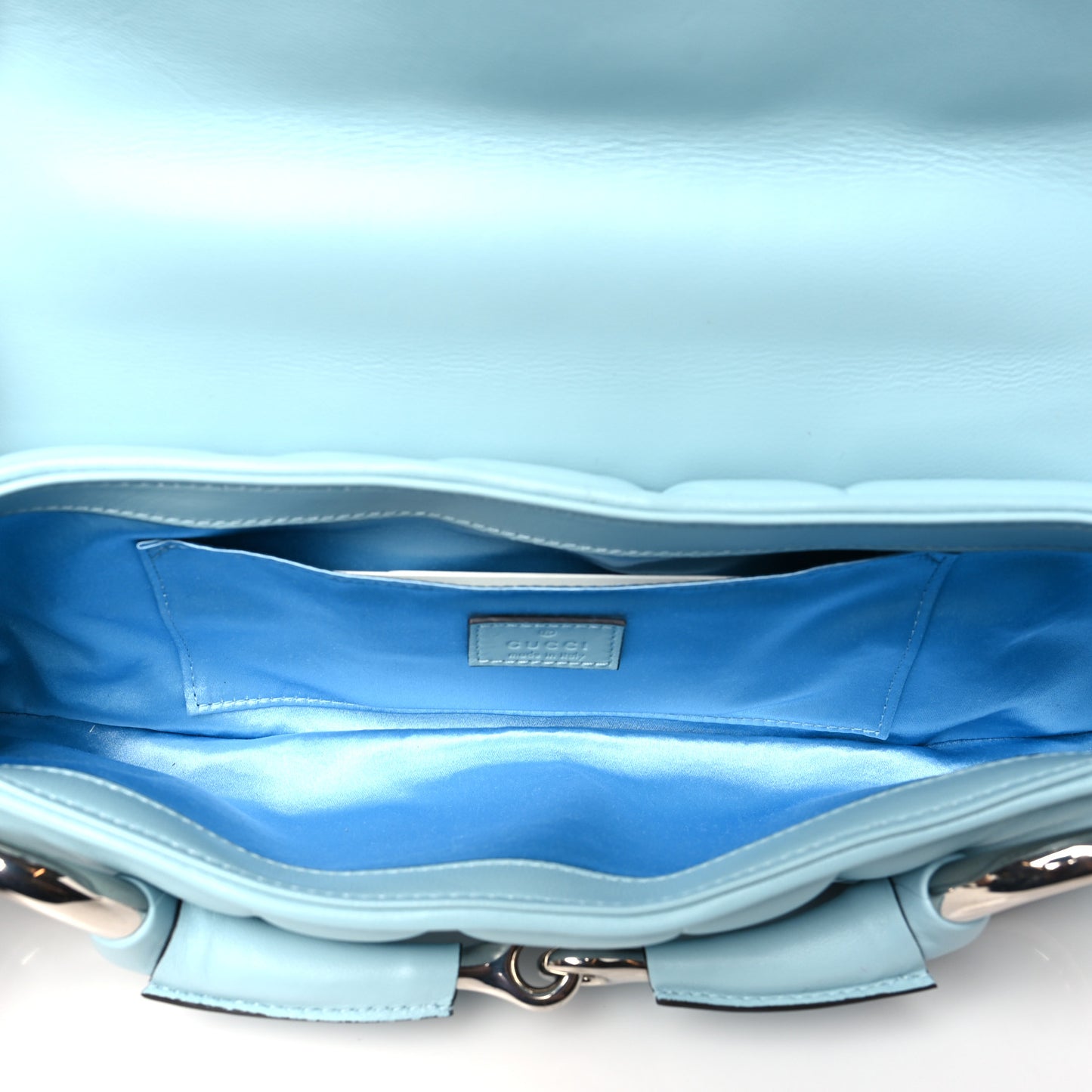 This is an authentic GUCCI Nappa Vertical Matelasse Medium Maxi Horsebit Chain Shoulder Bag in Crystal Snow. This shoulder bag is crafted of light blue nappa leather and silver hardware. The flap opens to a light blue satin interior with a patch pocket.Follow this item for alerts. Gucci is a registered trademark of Gucci. FASHIONPHILE is not affiliated with Gucci.