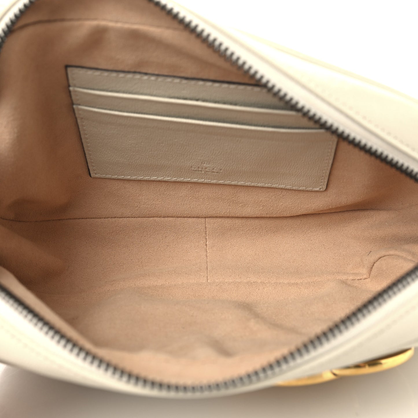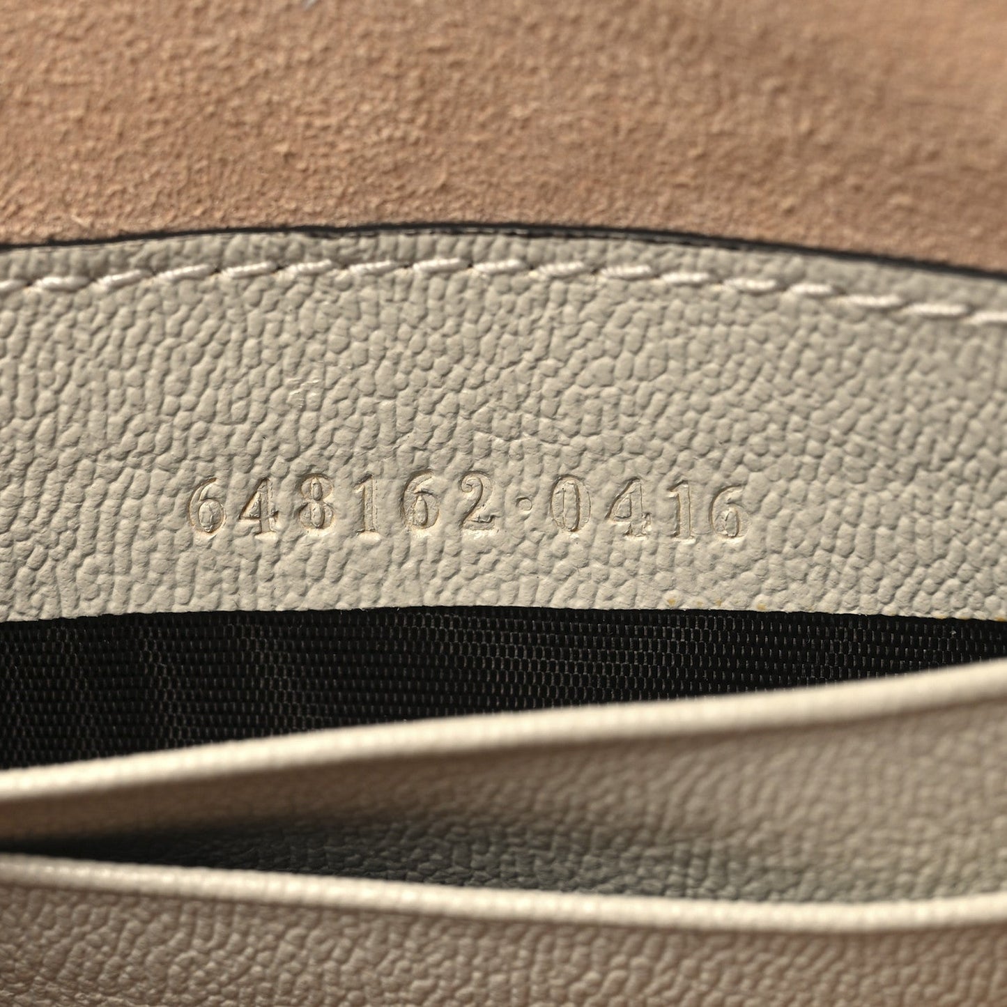 This is an authentic GUCCI New Sakai Calfskin Lux Dahlia Phone Case in Mystic White. This stylish phone case is crafted of calfskin leather in ivory. The sleek bag features a prominent GG monogram logo in polished brass with a top zipper opening. The interior has a beige fabric lining with two card slots.Follow this item for alerts. Gucci is a registered trademark of Gucci. FASHIONPHILE is not affiliated with Gucci.