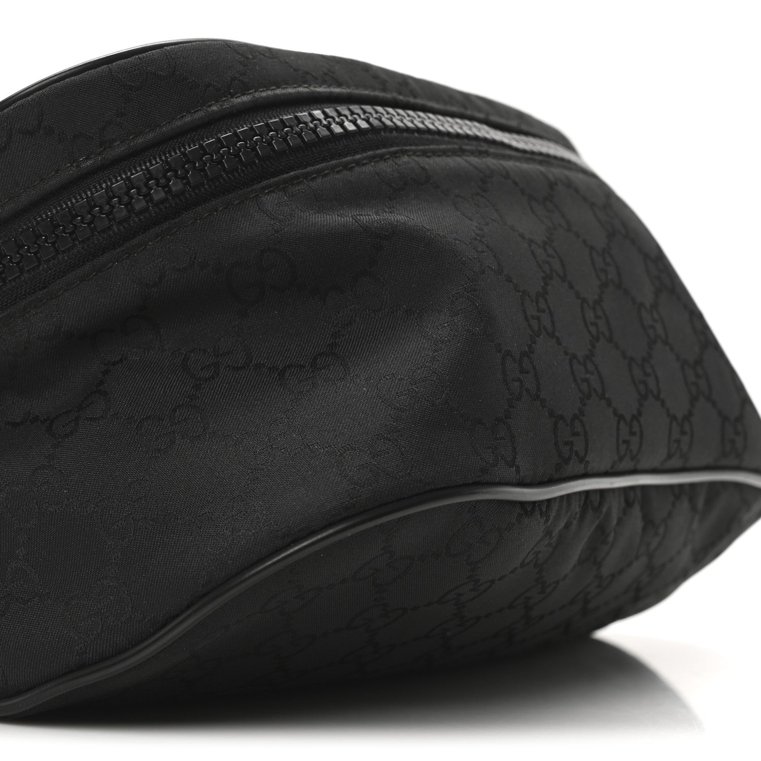 This is an authentic GUCCI Nylon Monogram Fanny Pack Belt Bag in Black. This chic belt bag is finely crafted of black Gucci GG monogram canvas and black leather trim. The bag features a canvas belt strap, rear zipper pocket, and silver hardware. The wrap around zipper opens to a black fabric interior with a patch pocket.Follow this item for alerts. Gucci is a registered trademark of Gucci. FASHIONPHILE is not affiliated with Gucci.