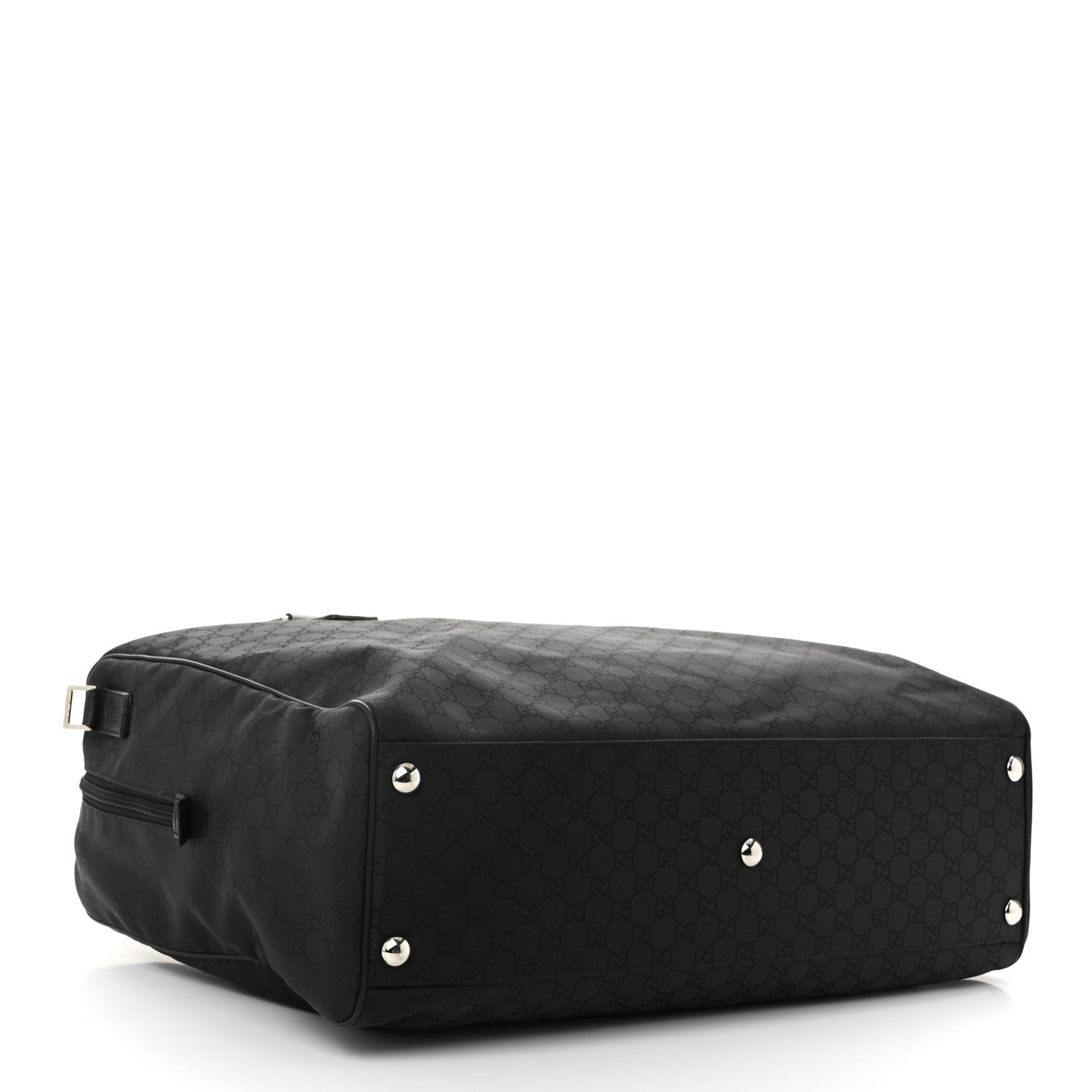 This is an authentic GUCCI Nylon Monogram Large Duffle Bag in Black. This excellent tote is crafted of Gucci GG monogram canvas in black. The bag features rolled leather top handles and an optional shoulder strap and silver hardware. This opens to a black fabric interior with a zipper pocket.Follow this item for alerts. Gucci is a registered trademark of Gucci. FASHIONPHILE is not affiliated with Gucci.