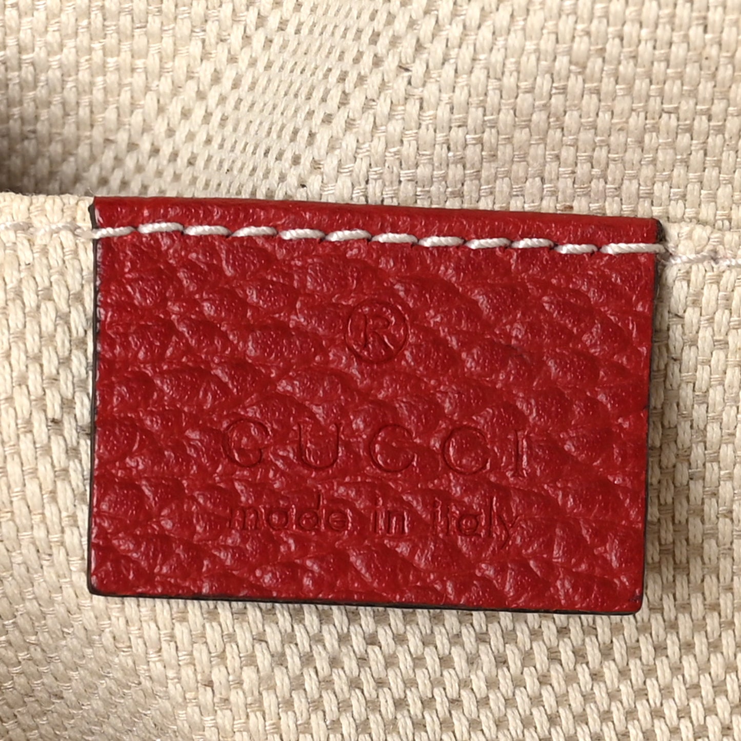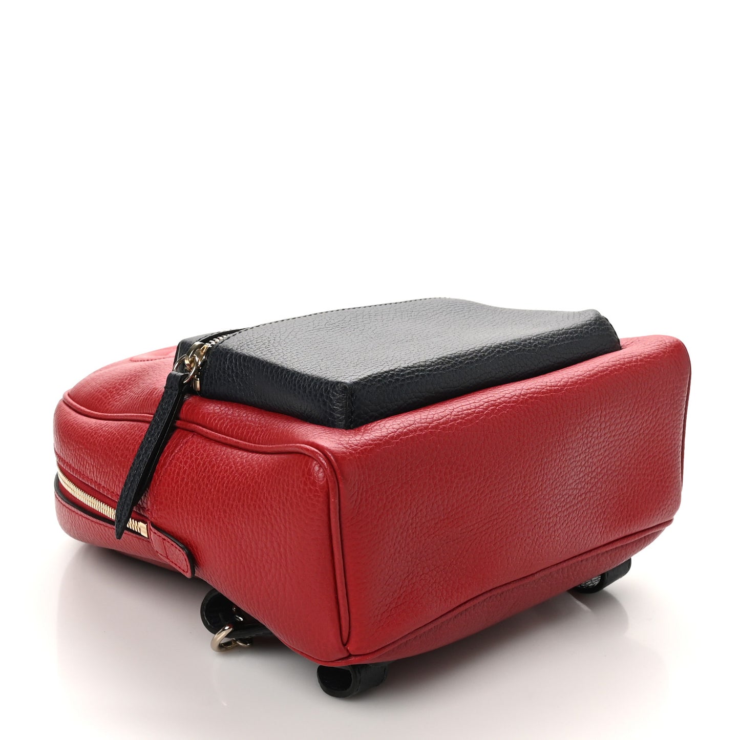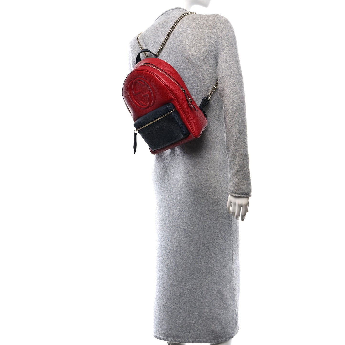 This is an authentic GUCCI Pebbled Calfskin Bi-Color Soho Chain Backpack in Red and Navy. This backpack is crafted of pebbled calfskin leather in red with a navy blue front zip pocket. It features gold-toned chain straps with leather adjustment tabs and a leather top grip. The main zipper opens to a natural canvas interior with patch pockets.Follow this item for alerts. Gucci is a registered trademark of Gucci. FASHIONPHILE is not affiliated with Gucci.