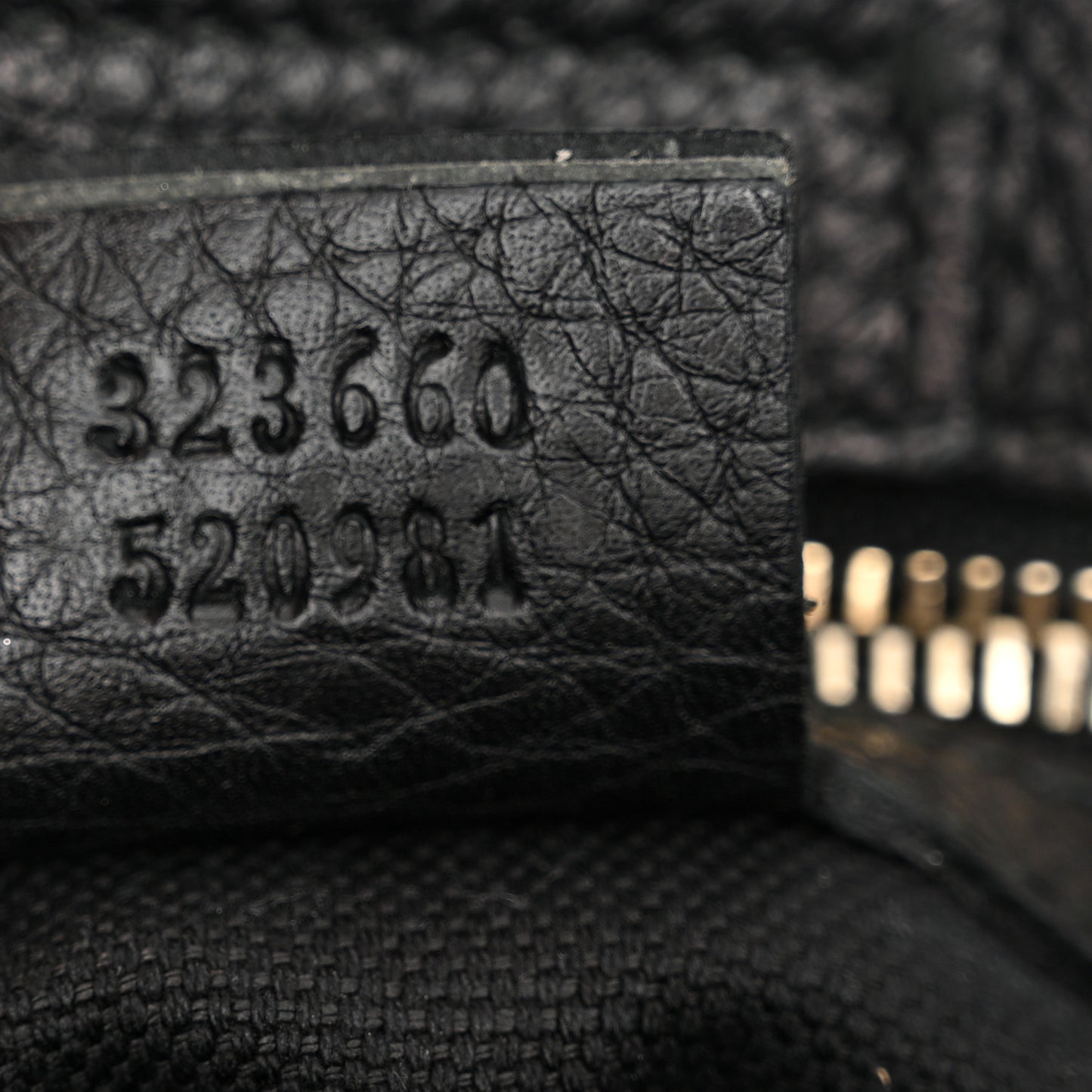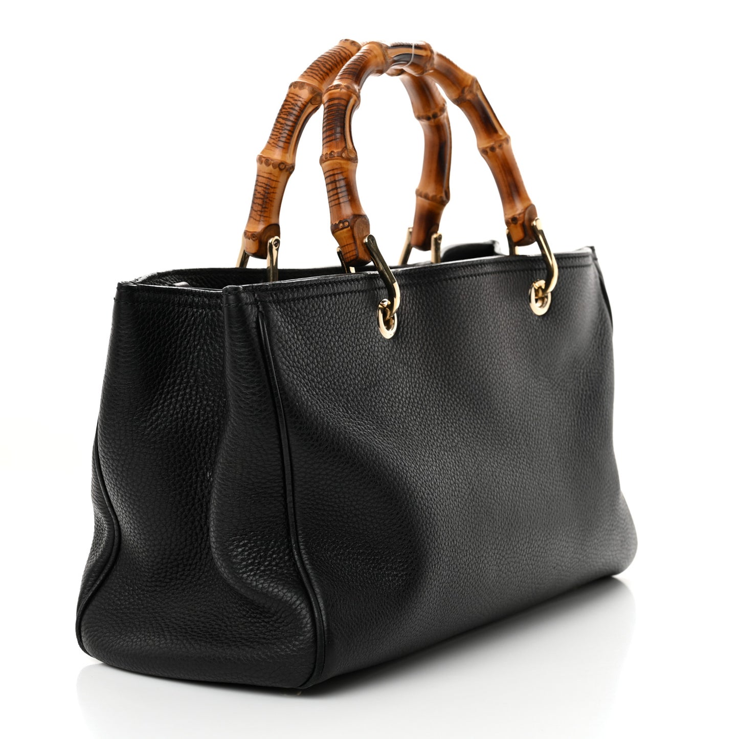 This is an authentic GUCCI Pebbled Calfskin Medium Bamboo Shopper Tote in Black. This stylish tote is crafted of deep, richly textured, black calfskin leather. The bag features arched bamboo top handles with light polished brass ring links. The top opens to a partitioned black fabric interior with a central zipper compartment and patch pockets.Follow this item for alerts. Gucci is a registered trademark of Gucci. FASHIONPHILE is not affiliated with Gucci.