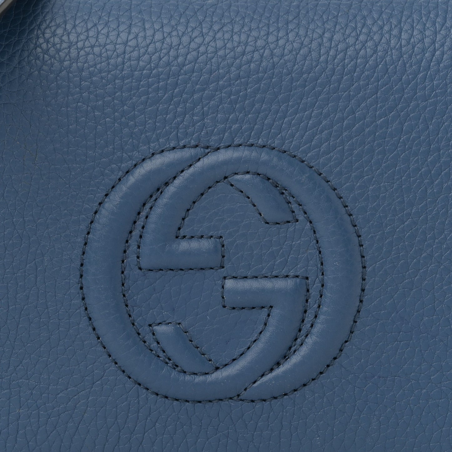 This is an authentic GUCCI Pebbled Calfskin Soho Wallet on Chain in Caspian. This stylish shoulder bag is crafted of textured calfskin leather in blue with a large stitched interlocking G logo. The bag features an optional polished gold chain link shoulder strap with a leather shoulder pad and a front flap that opens to a fabric and leather interior with card slots, a front and back patch pocket, and a zipper compartment.Follow this item for alerts. Gucci is a registered trademark of Gucci. FASHIONPHILE is not affiliated with Gucci.