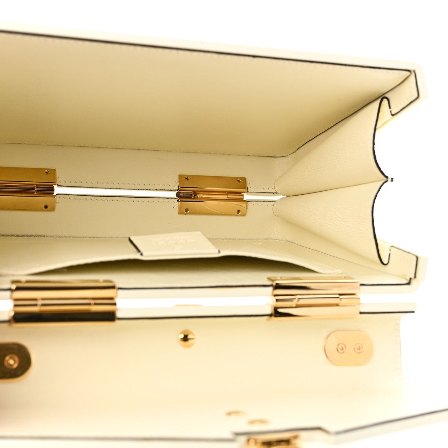 This is an authentic GUCCI Plexiglass Sylvie 1969 Mini Top Handle Bag in Ivory. This handbag is crafted of smooth and high polished plexiglass in white. The shoulder bag has a polished gold tone buckle lock closure, a plexiglass top handle and an optional high polished gold tone chain shoulder strap. The top flap opens to an accordion style white leather interior with a patch pocket.Follow this item for alerts. Gucci is a registered trademark of Gucci. FASHIONPHILE is not affiliated with Gucci.
