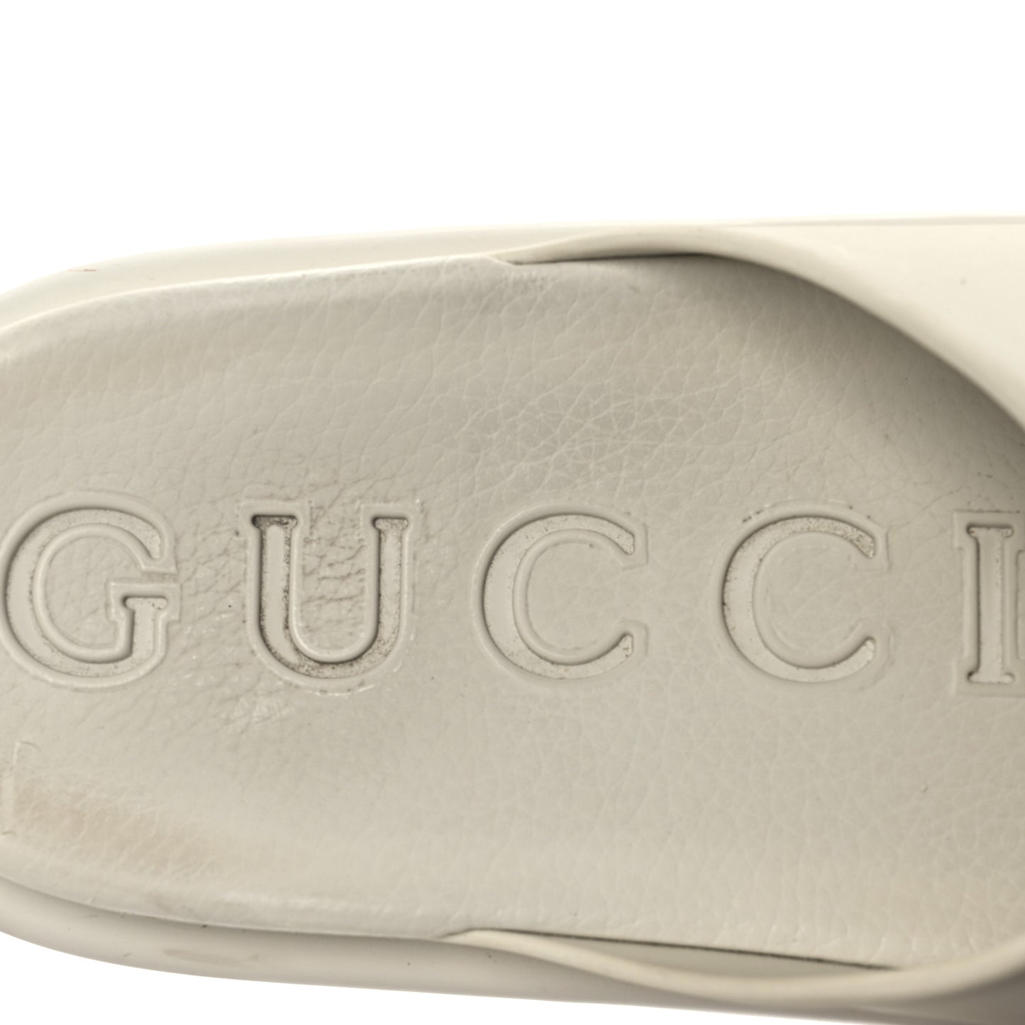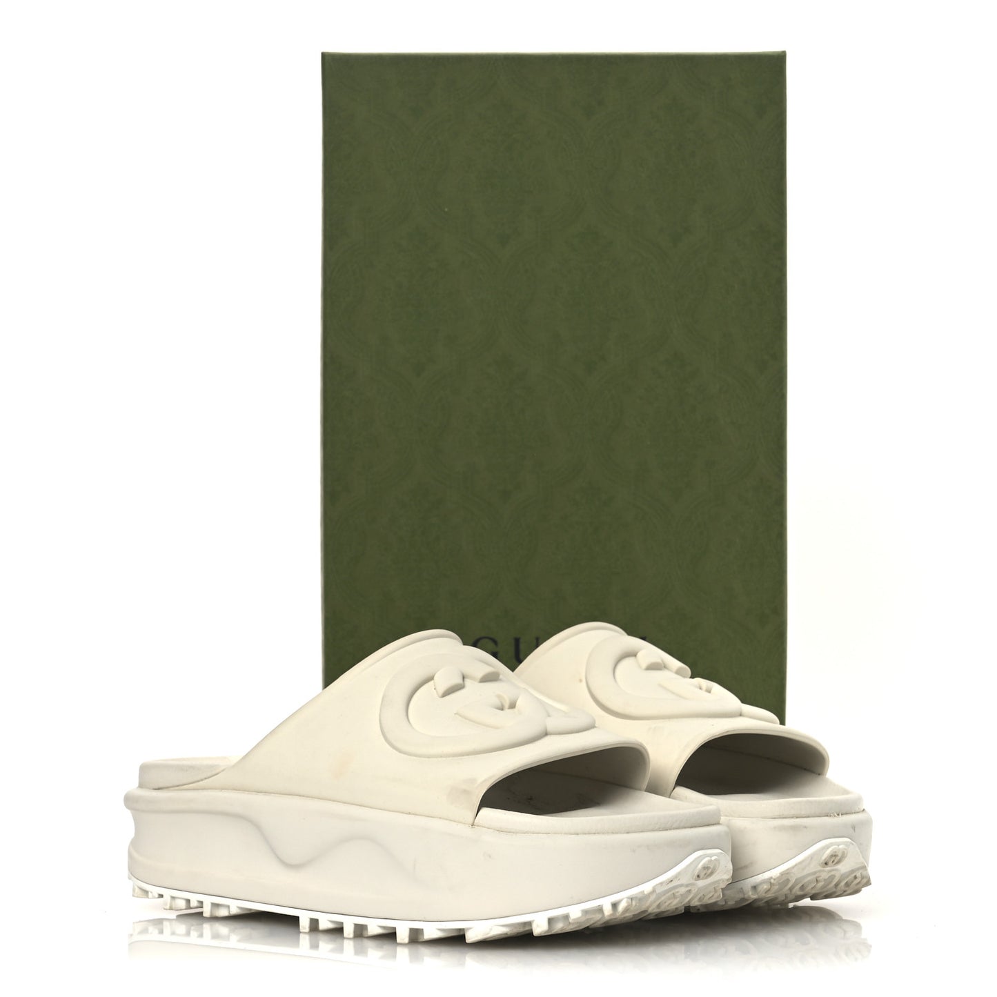 This is an authentic pair of GUCCI Soft Rubber Womens Interlocking G Platform 42mm Slide Sandals size 40 in Off White. These stylish sandals are crafted of white rubber with a GUCCI interlocking G logo on the toe strap.Follow this item for alerts. Gucci is a registered trademark of Gucci. FASHIONPHILE is not affiliated with Gucci.
