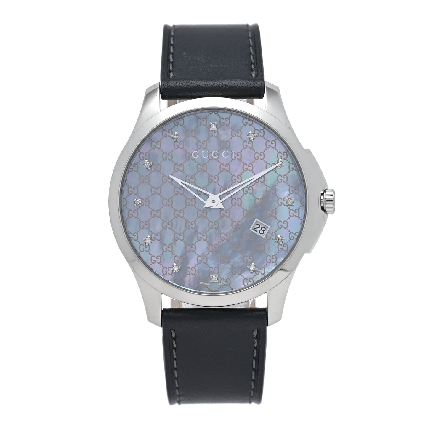 This is an authentic GUCCI Stainless Steel Calfskin Diamond Grey Mother of Pearl 40mm G-Timeless Quartz Watch. The watch is crafted of stainless steel and features a black mother of pearl dial with diamond hour markers, sapphire crystal, and a quartz movement.Follow this item for alerts. Gucci is a registered trademark of Gucci. FASHIONPHILE is not affiliated with Gucci.