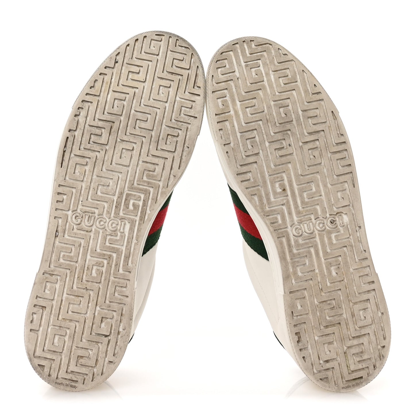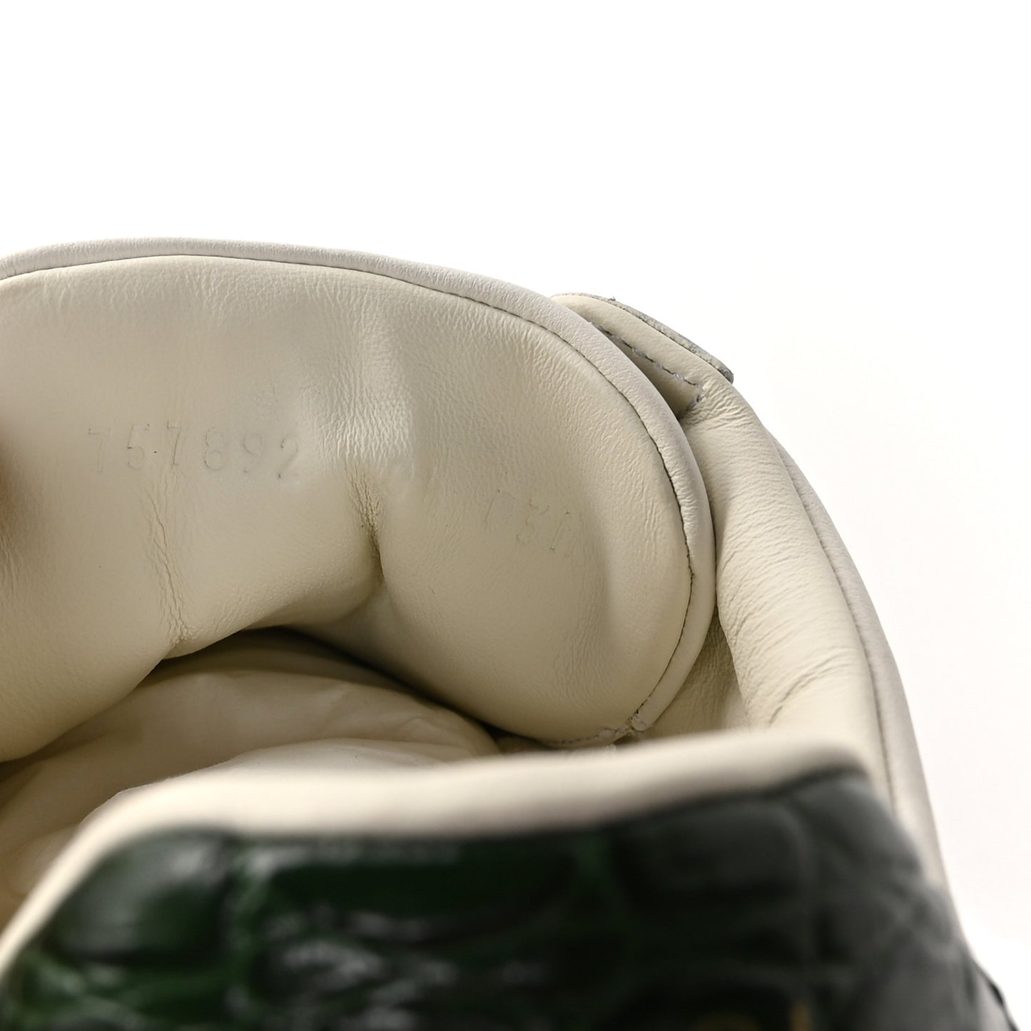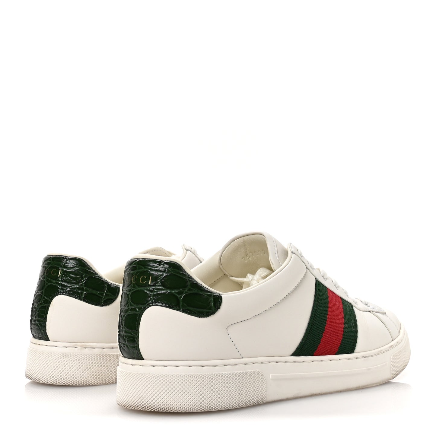 This is an authentic pair of GUCCI Calfskin Crocodile Web Mens Ace Sneakers 8.5 in Green Ace. These stylish sneakers are crafted of white leather with green and red nylon stripes at the sides and green crocodile-embossed leather detailing at the heels.Follow this item for alerts. Gucci is a registered trademark of Gucci. FASHIONPHILE is not affiliated with Gucci.
