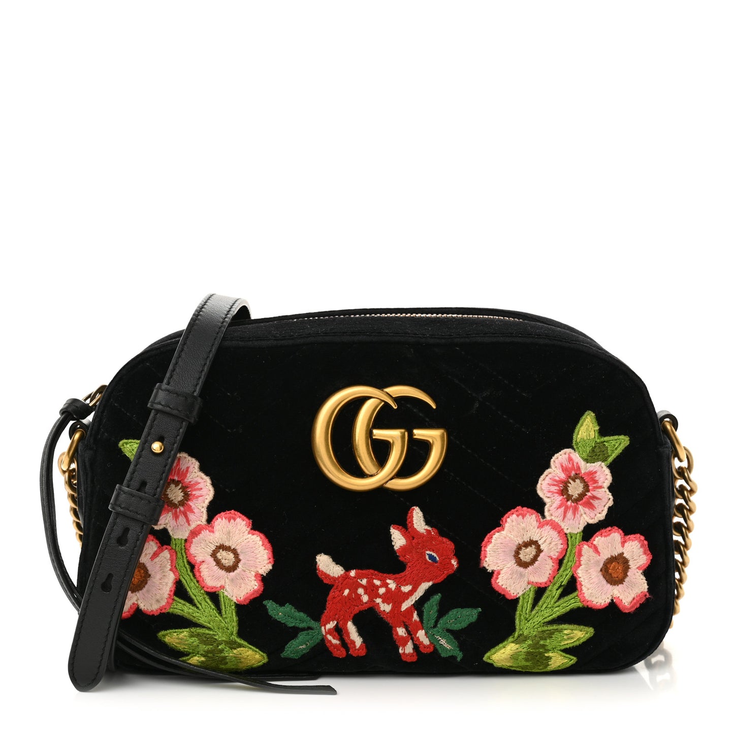 Gucci/ Bags/ Shoulder Bags /Gucci Velvet Matelasse Deer Embroidered Small GG Marmont Chain Shoulder Bag Black