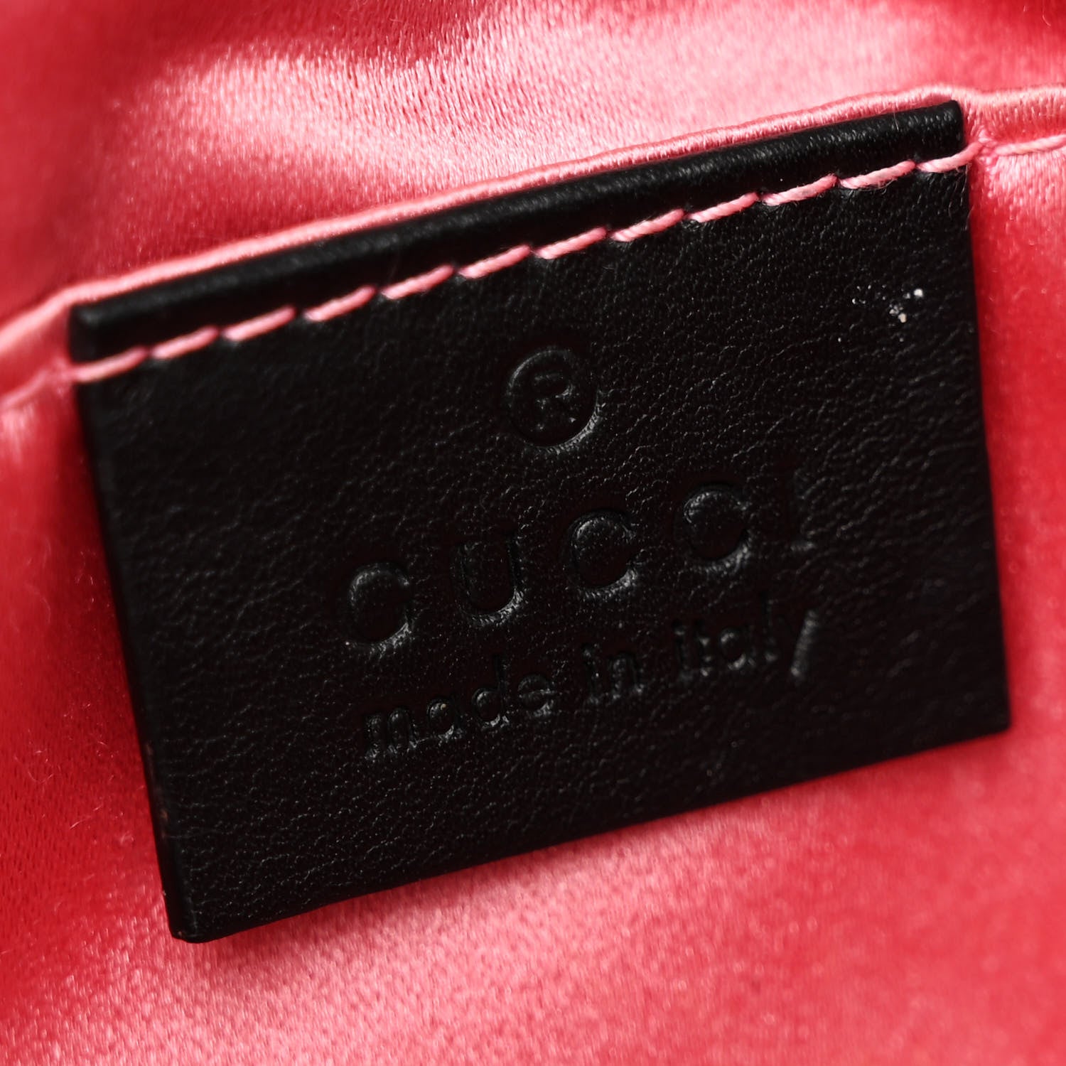 This is an authentic GUCCI Velvet Matelasse Mini GG Marmont Shoulder Bag in Black. This structured bag is crafted of soft quilted velvet in black, with a heart stitched on the back. It features an aged gold chain-link shoulder strap with a black leather shoulder pad and a matching gold Gucci GG logo on the crossover flap. The bag opens with a press lock to a pink satin fabricĀ interior with a patch pocket.Follow this item for alerts.Ā Gucci is a registered trademark of Gucci. FASHIONPHILE is not affiliated with Gucci.