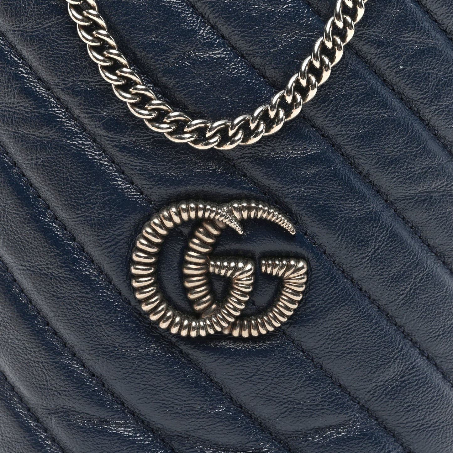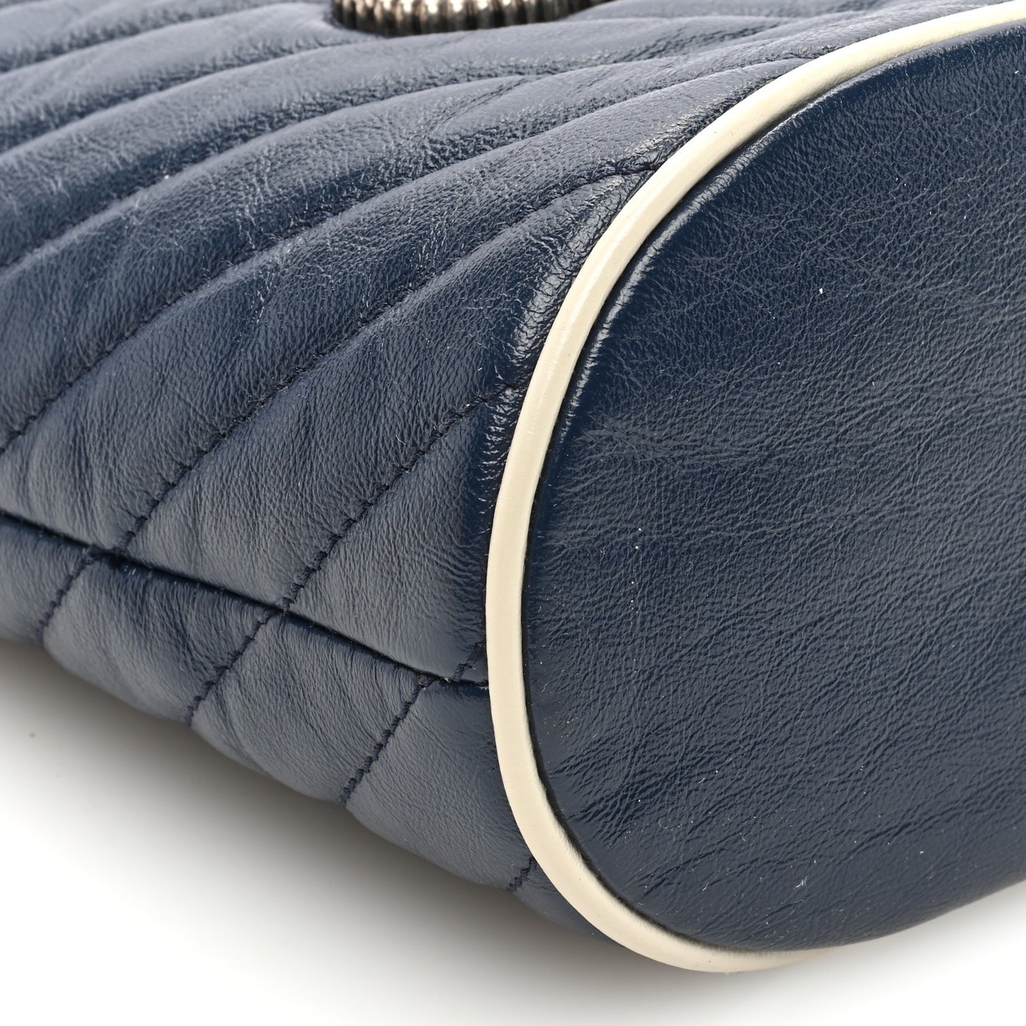 This is an authentic GUCCI Vintage Effect Calfskin Matelasse Diagonal Mini Torchon GG Marmont 2.0 Bucket Bag in Blue Agata and Mystic White. This soft-structured bucket bag is crafted of calfskin leather in dark blue. It features an aged chain shoulder strap, a top cinch cord, and an aged silver interlocking GG logo. This bag opens to a beige microfiber interior with card slots and a removable key ring.Follow this item for alerts. Gucci is a registered trademark of Gucci. FASHIONPHILE is not affiliated with Gucci.