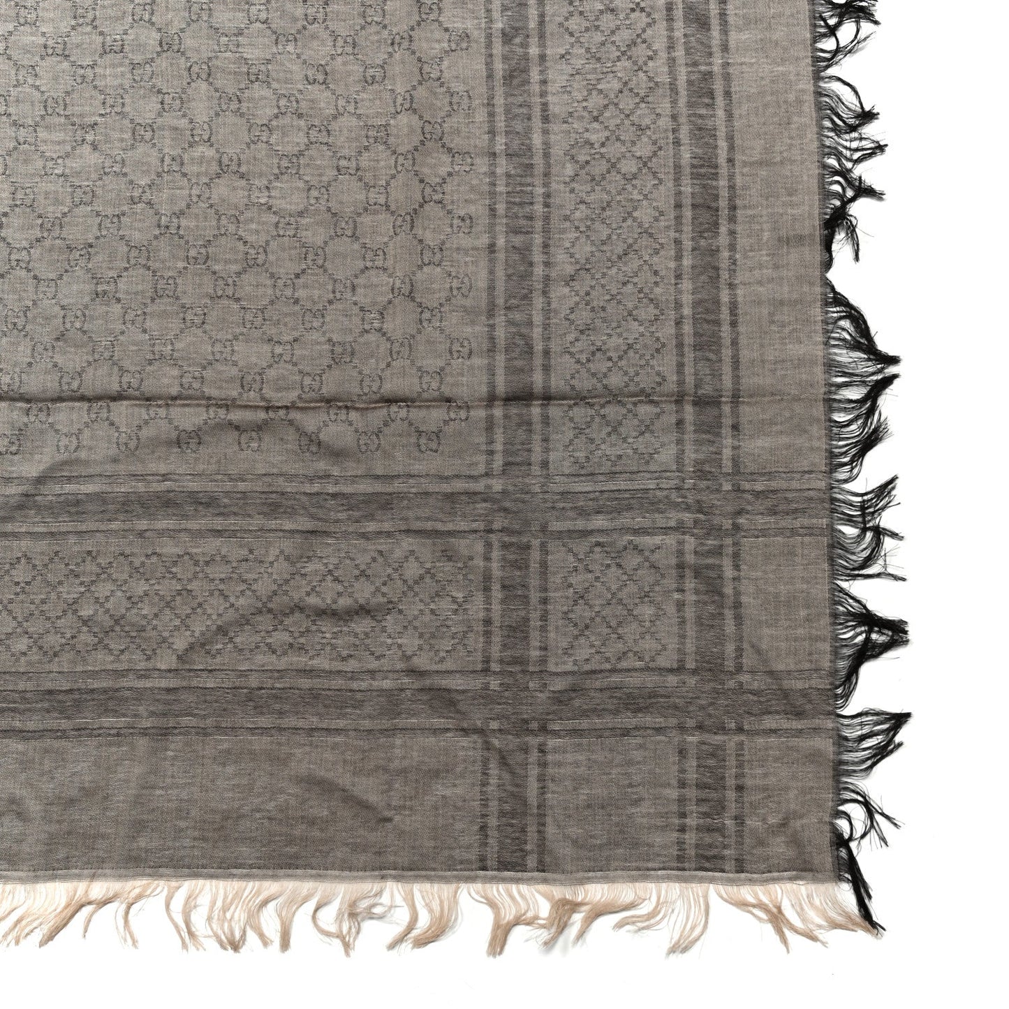 This is an authentic GUCCI Wool Silk GG Monogram Diamante Plaid Surviee Shawl in Beige and Dark Brown. This sophisticated shawl is finely crafted of 80% wool and 20% silk, with a tonal brown on beige Gucci GG monogram with fringed edges.Follow this item for alerts. Gucci is a registered trademark of Gucci. FASHIONPHILE is not affiliated with Gucci.