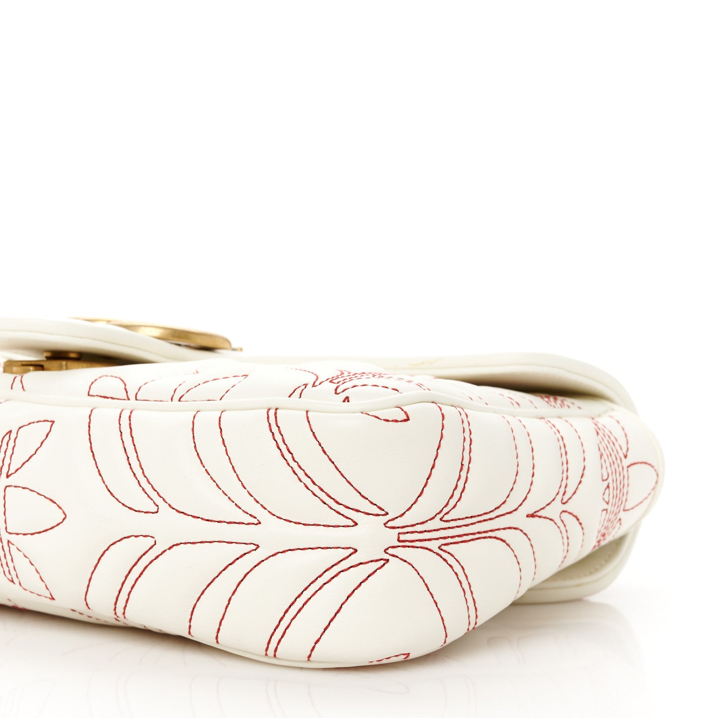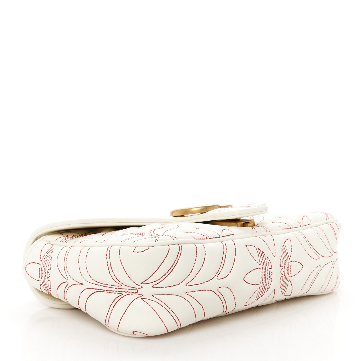 This is an authentic GUCCI X ADIDAS Calfskin Matelasse Small GG Marmont Shoulder Bag in Off White. This shoulder bag is crafted of calfskin leather in white with red embroidered Adidas Trefoils. The bag features an aged gold chain link shoulder strap with a white leather shoulder pad, and a matching gold Gucci GG logo on the crossover flap. The bag opens with a press lock to a beige fabric interior with a zipper pocket.Follow this item for alerts. Gucci is a registered trademark of Gucci. FASHIONPHILE is not affiliated with Gucci.
