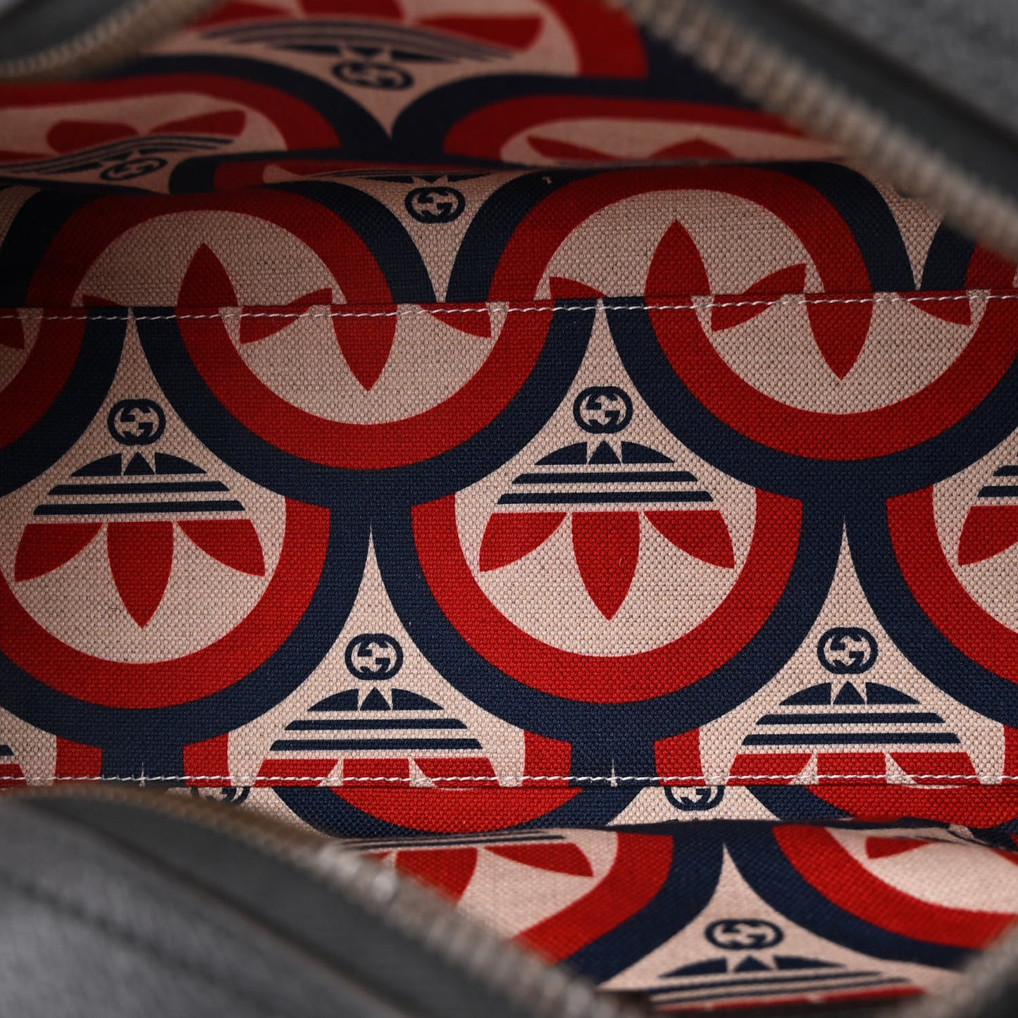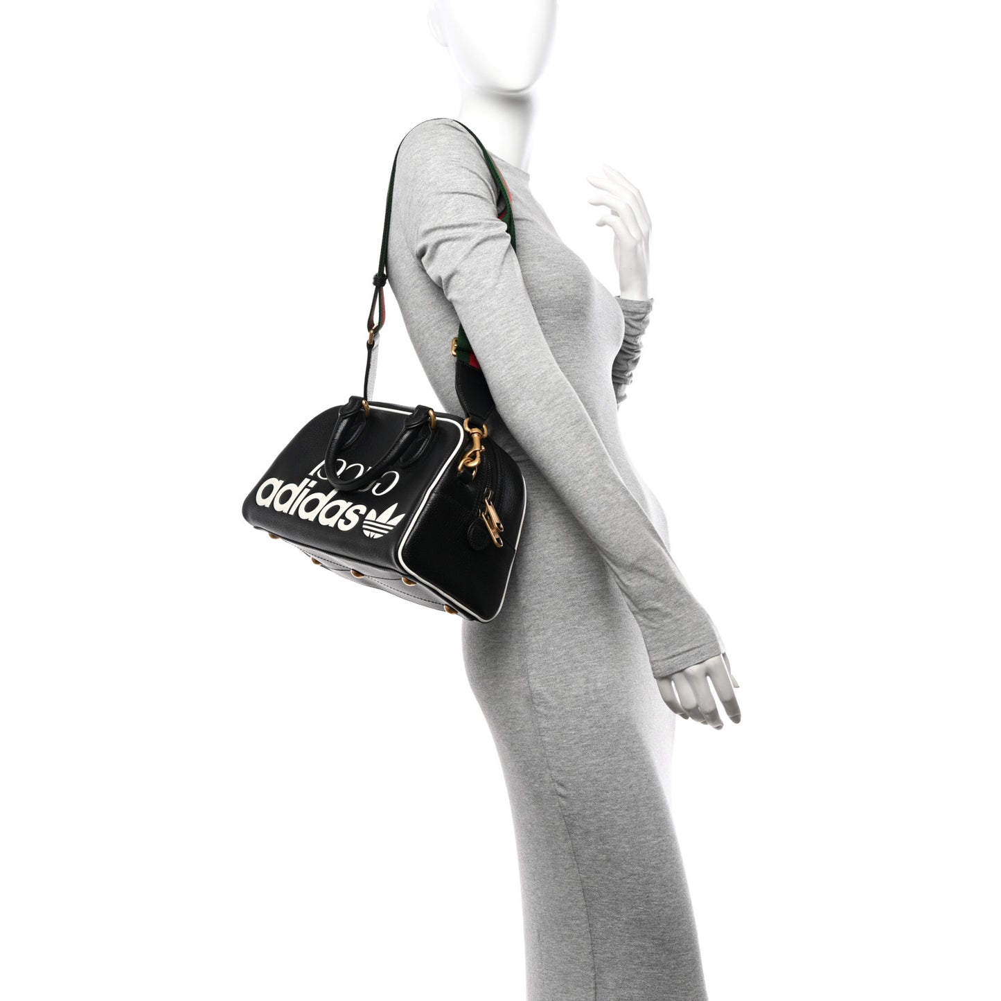This is an authentic GUCCI X ADIDAS Textured Dollar Calfskin Web Trefoil Logo Embossed Mini Bowling Bag in Black. This stylish tote from the Gucci X Adidas collaboration is made of black calfskin leather and features the signature Adidas Trefoil. The handbag has rolled leather top handles, an optional web striped shoulder strap, and gold hardware. The top zipper opens to a trefoil printed fabric interior with a zippered pocket.Follow this item for alerts. Gucci is a registered trademark of Gucci. FASHIONPHILE is not affiliated with Gucci.