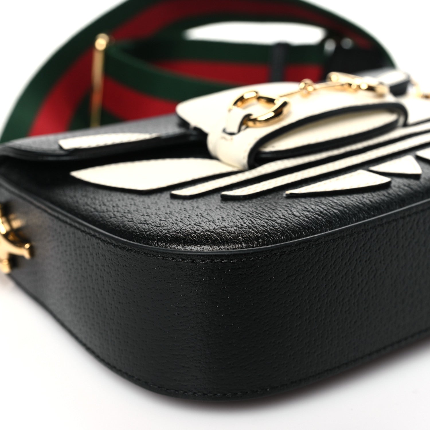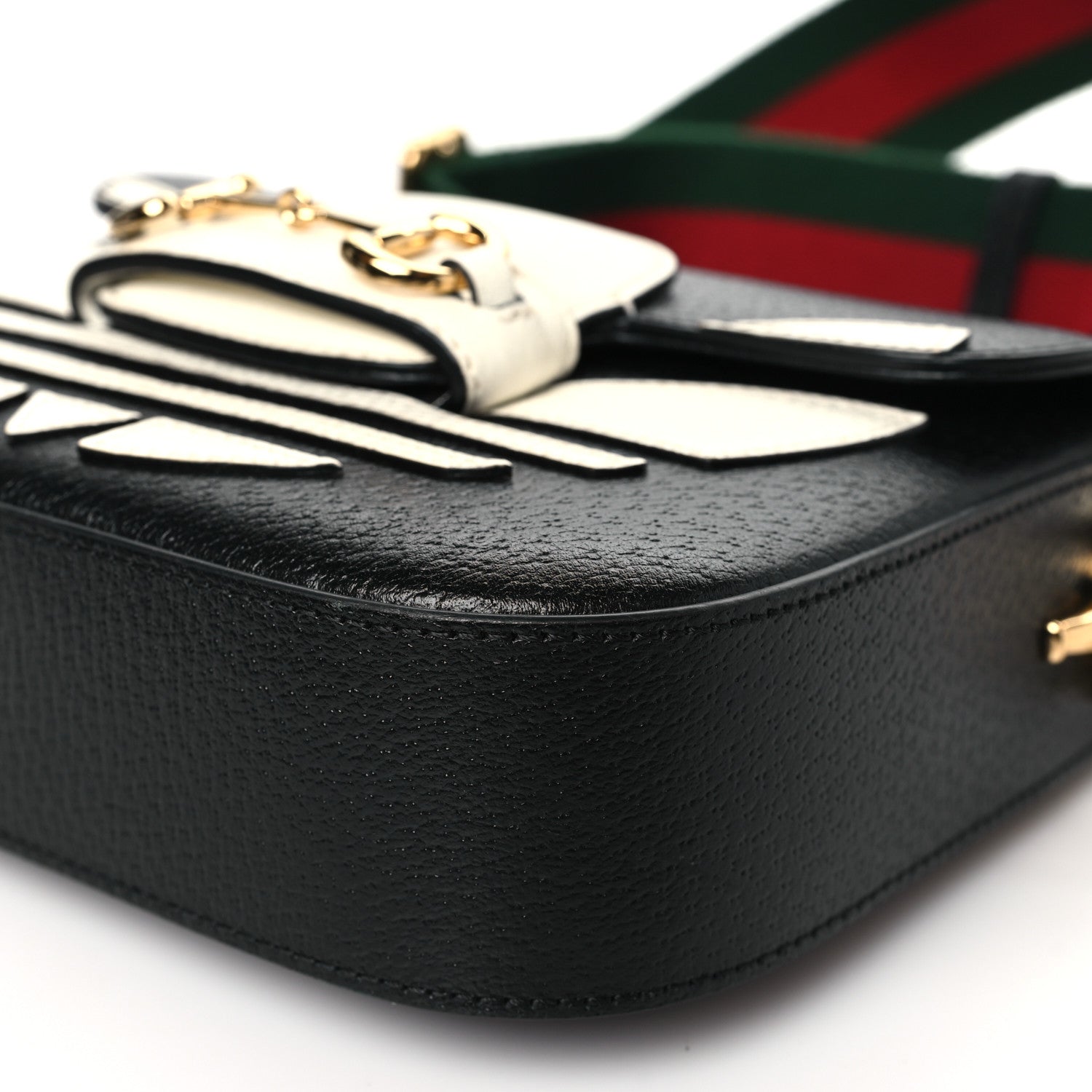 This is an authentic GUCCI X ADIDAS Textured Calfskin Web Trefoil Mini Horsebit 1955 Shoulder Bag in Black and Off White. This stylish shoulder bag was designed in a collaboration between Gucci and Adidas and is crafted in beautiful leather in black with the Adidas logo in white. The bag features an adjustable leather shoulder strap, red and green web canvas strap and gold horsebit detail. The top flap opens to a beige fabric interior.Follow this item for alerts. Gucci is a registered trademark of Gucci. FASHIONPHILE is not affiliated with Gucci.