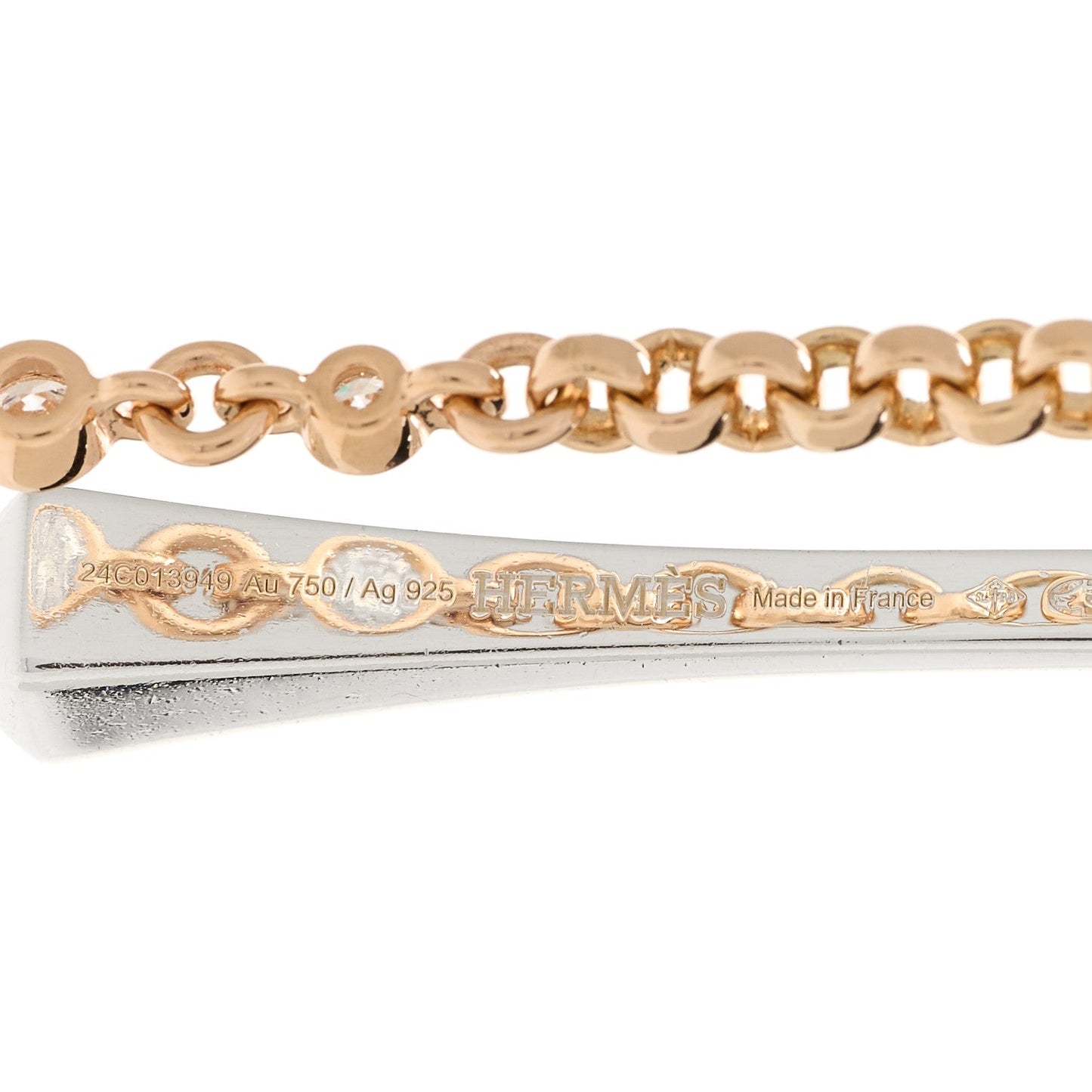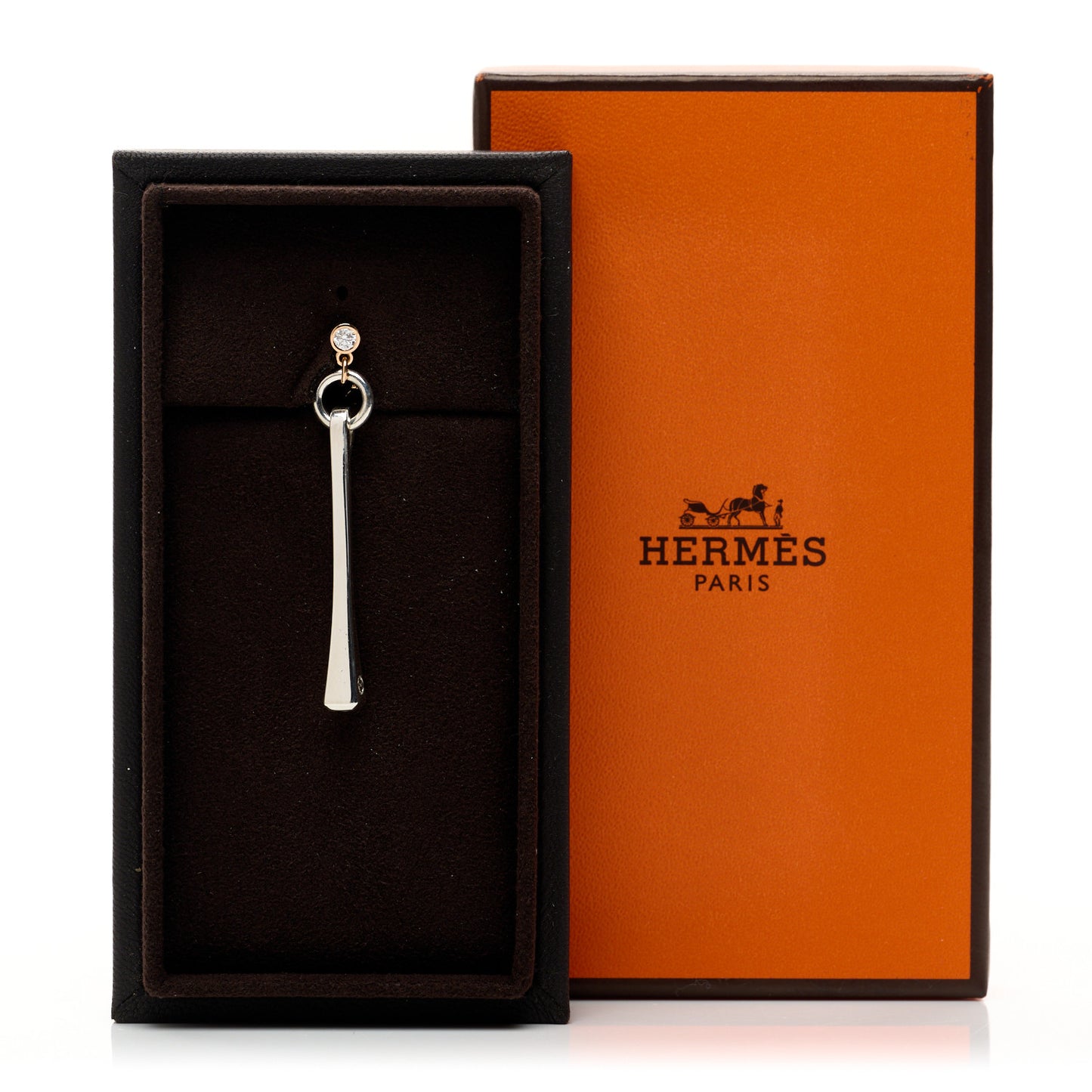 This is an authentic of HERMES 18K Rose Gold Sterling Silver Mix and H Single Dangle Earring. This earring is crafted of sterling silver and 18 karat rose gold and features an elongated clou motif and chain accented with diamonds, weighing approximately .18 total carat weight.Follow this item for alerts. Hermes is a registered trademark of Hermes. FASHIONPHILE is not affiliated with Hermes.