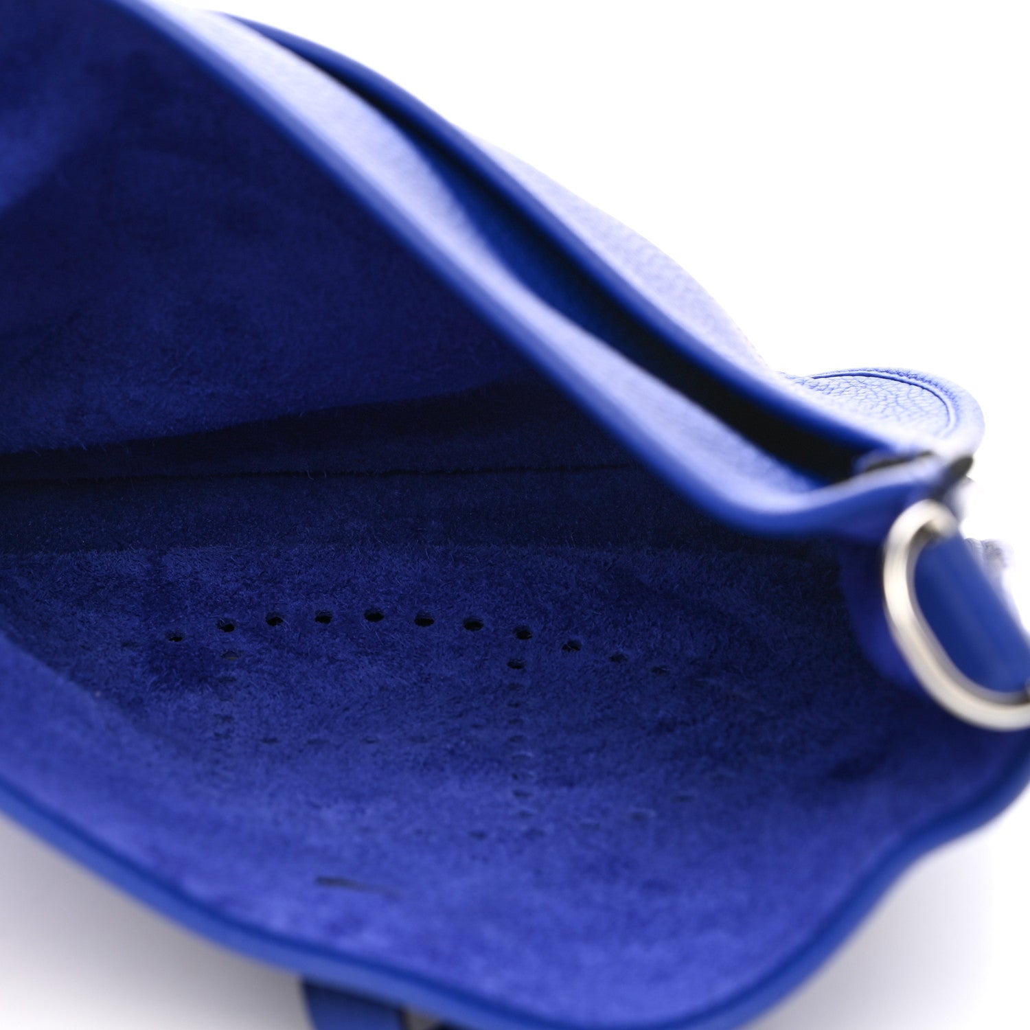 This is an authentic HERMES Amazone Evelyne III PM in Bleu Electrique and Black. This stylish messenger bag is crafted of fine Taurillon Clemence calfskin leather in bright blue. The shoulder bag features a darker blue canvas shoulder strap, palladium silver hardware, and a perforated Hermes H oval on the front of the bag. The top of the bag opens with a cross over strap to a matching suede interior.Follow this item for alerts. Hermes is a registered trademark of Hermes. FASHIONPHILE is not affiliated with Hermes.